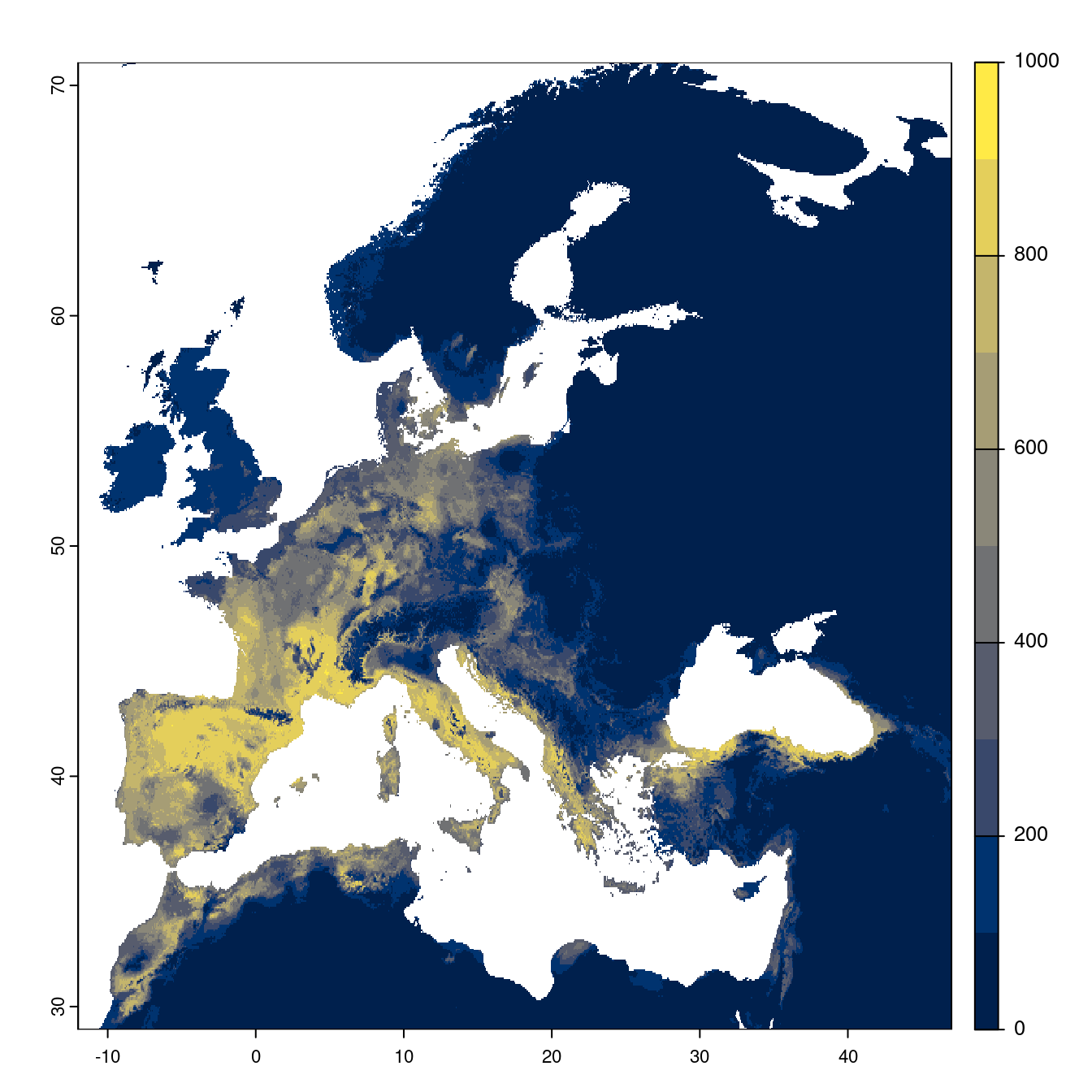 On évalue la proportion d’occurrences dans chaque région, en utilisant les 3 masques créés précédemment. Si on a au moins 50 % des occurrences dans une région, on peut continuer en travaillant uniquement sur ces données. Sinon, on vérifie qu’au moins 67 % des données tombent dans l’ensemble des régions, et on prend la région la plus représentée. Au final, s’il s’agit d’une espèce endémique d’Europe, on n’a pas besoin de manipulation supplémentaire.