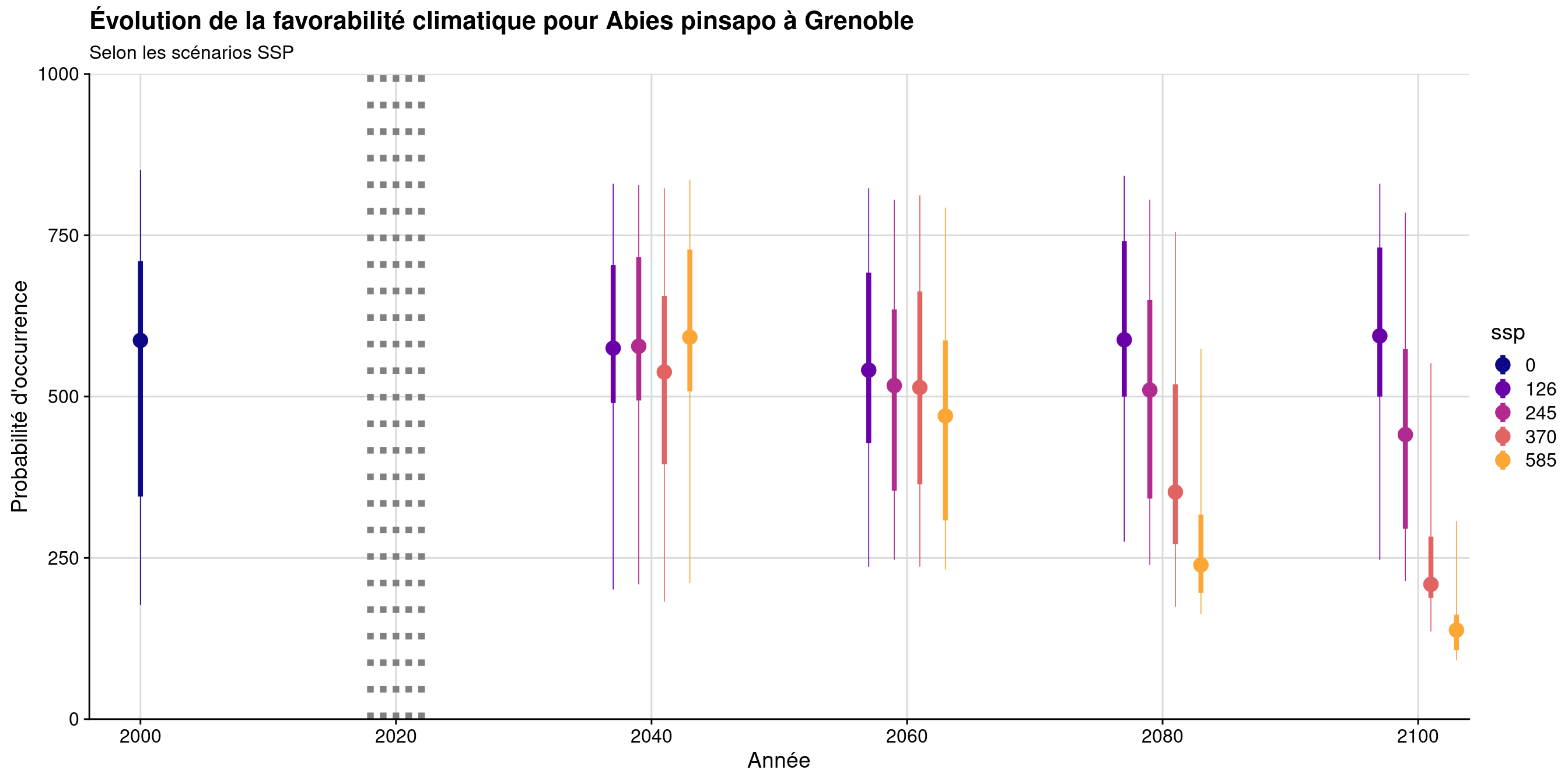 Figure 105.28: Évolution de la favorabilité climatique au cours du XXIème siècle. Le point représente la médiane sur l’étendue de la métropole (i.e. tous les pixels de la carte) ; le trait gras représente 50 % des données intermédiaires (espace inter-quartile) ; le trait fin représente le reste des données du minimum au maximum.
