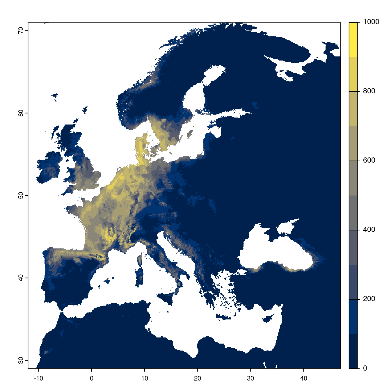 On obtient 99.89 % d’occurrences en Europe, on est bien sur une espèce endémique de la région. On peut récupérer les données d’Europe, et les cartographier :