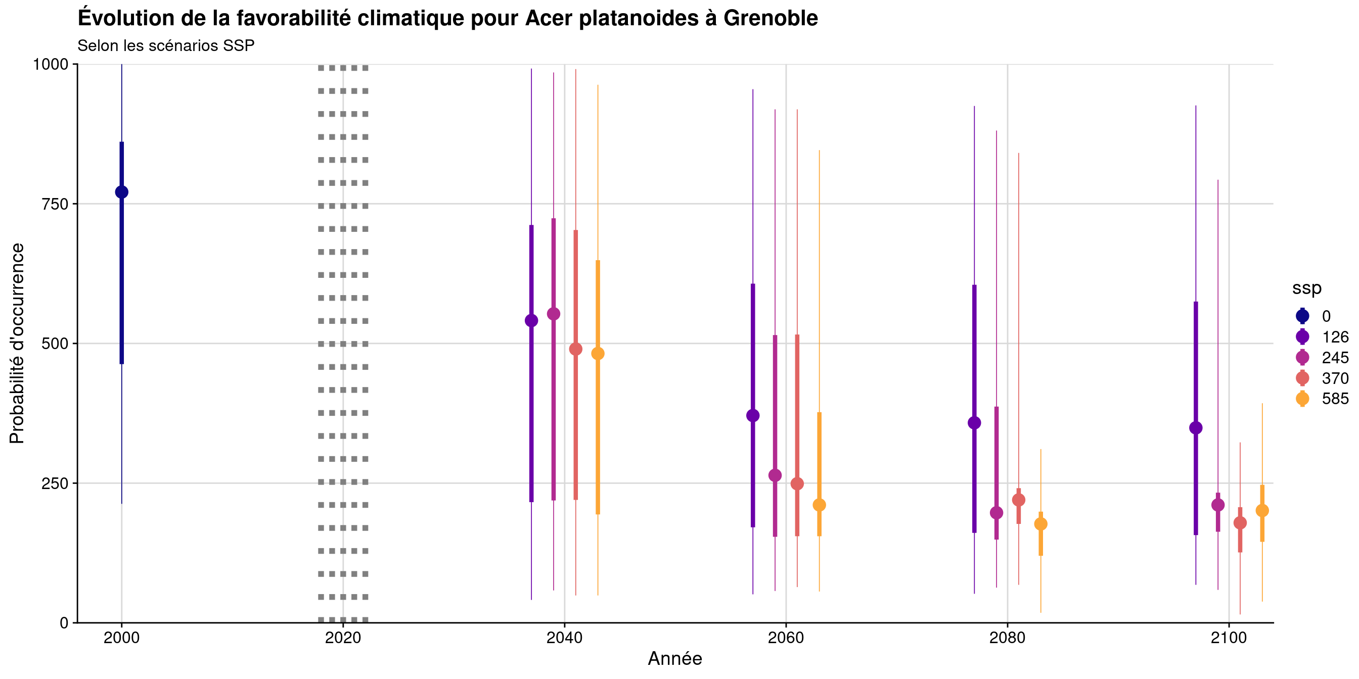 Figure 17.28: Évolution de la favorabilité climatique au cours du XXIème siècle. Le point représente la médiane sur l’étendue de la métropole (i.e. tous les pixels de la carte) ; le trait gras représente 50 % des données intermédiaires (espace inter-quartile) ; le trait fin représente le reste des données du minimum au maximum.