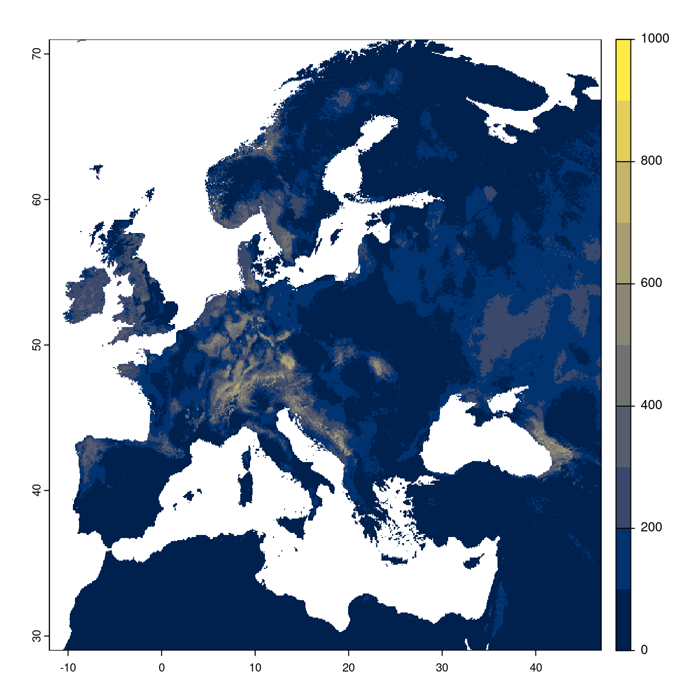 On évalue la proportion d’occurrences dans chaque région, en utilisant les 3 masques créés précédemment. Si on a au moins 50 % des occurrences dans une région, on peut continuer en travaillant uniquement sur ces données. Sinon, on vérifie qu’au moins 67 % des données tombent dans l’ensemble des régions, et on prend la région la plus représentée. Au final, s’il s’agit d’une espèce endémique d’Europe, on n’a pas besoin de manipulation supplémentaire.