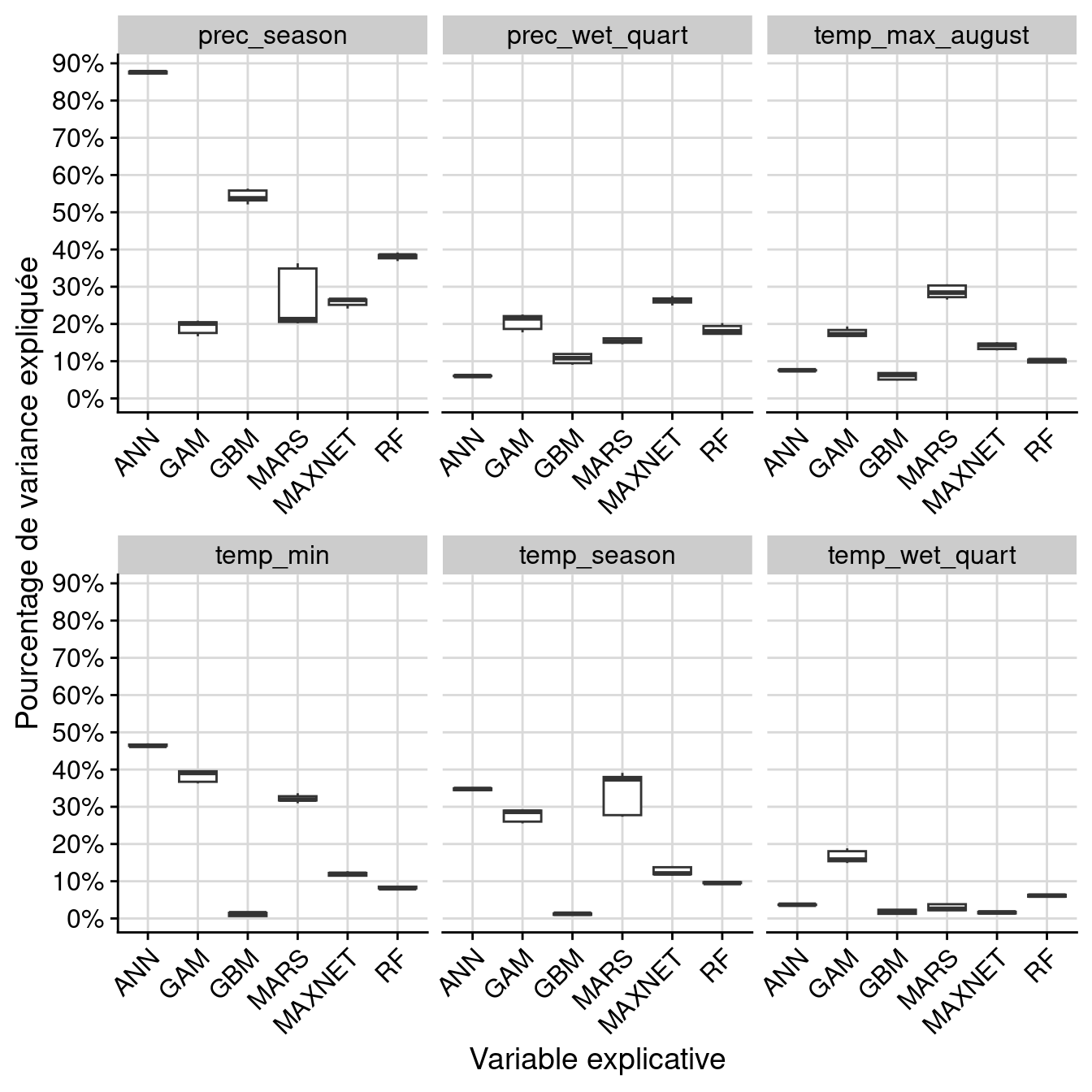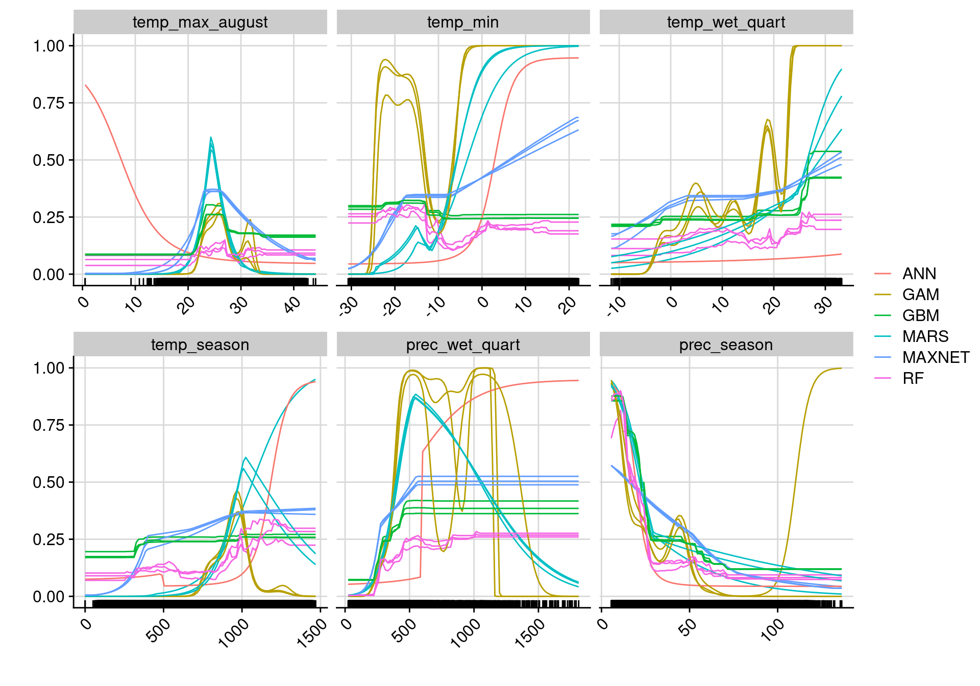 Figure 44.13: Courbes de réponse de chaque variable climatique dans le modèle d’ensemble.