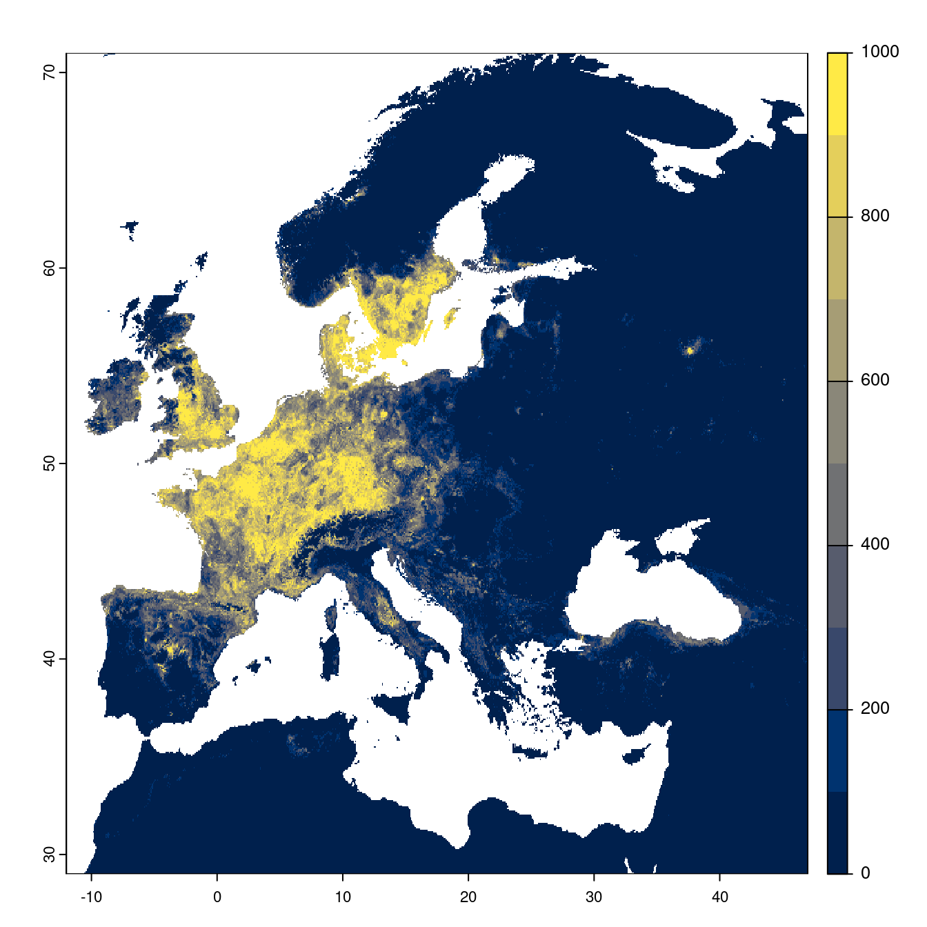 On obtient 95.67 % d’occurrences en Europe, on est bien sur une espèce endémique de la région. On peut récupérer les données d’Europe, et les cartographier :