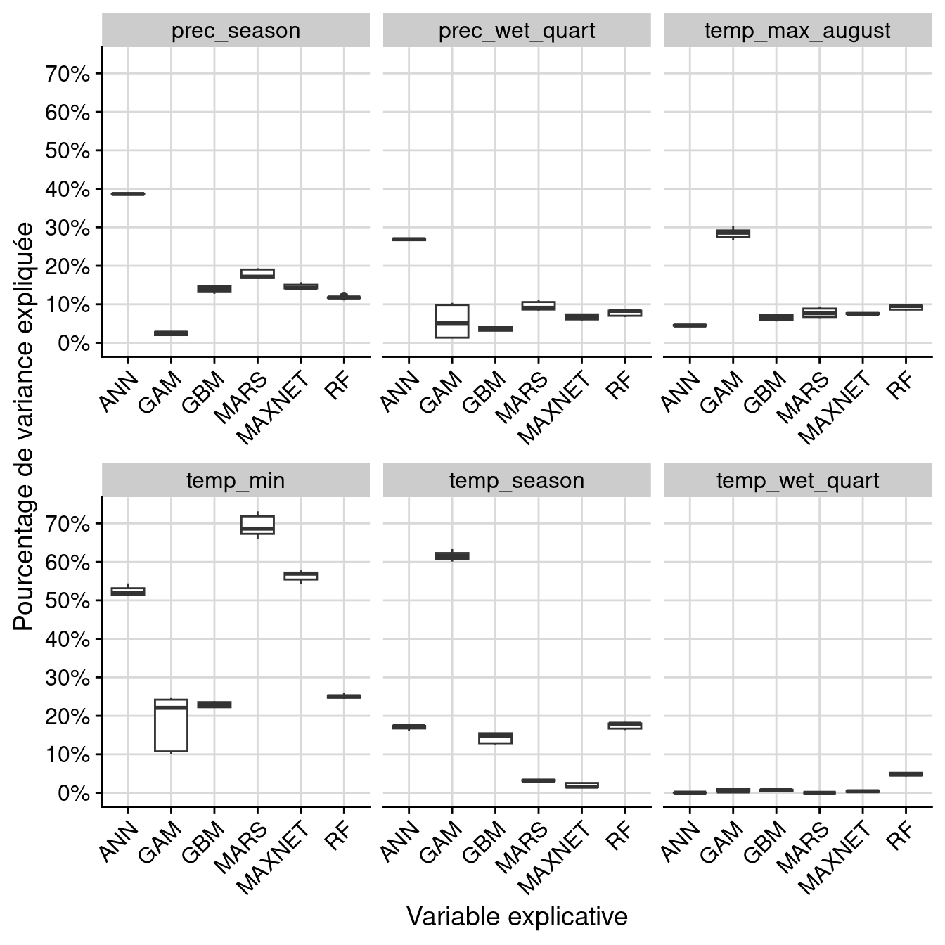 Figure 48.13: Courbes de réponse de chaque variable climatique dans le modèle d’ensemble.