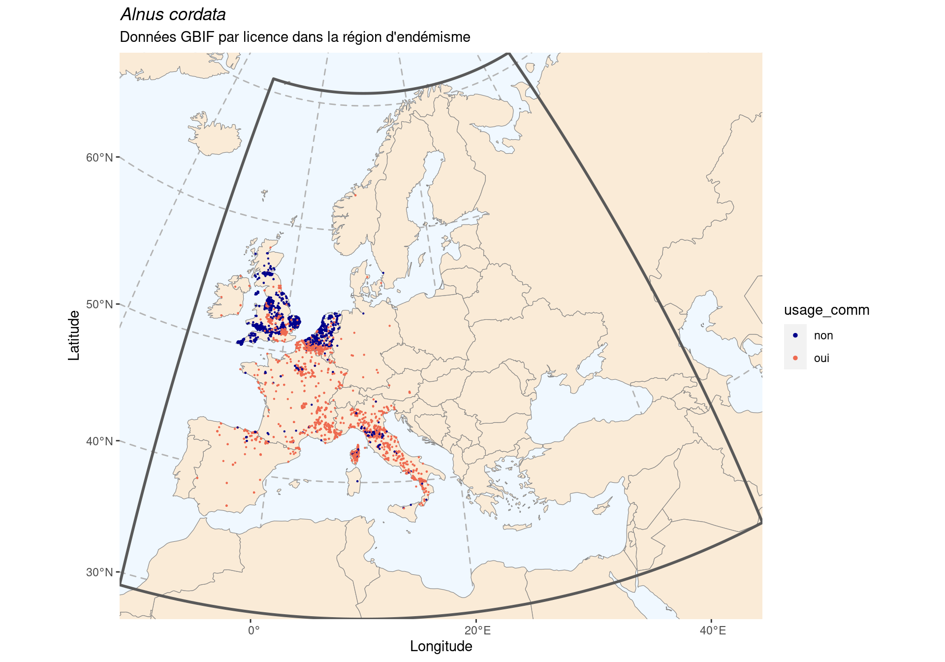 Figure 48.1: Occurrences de Alnus cordata dans le monde.