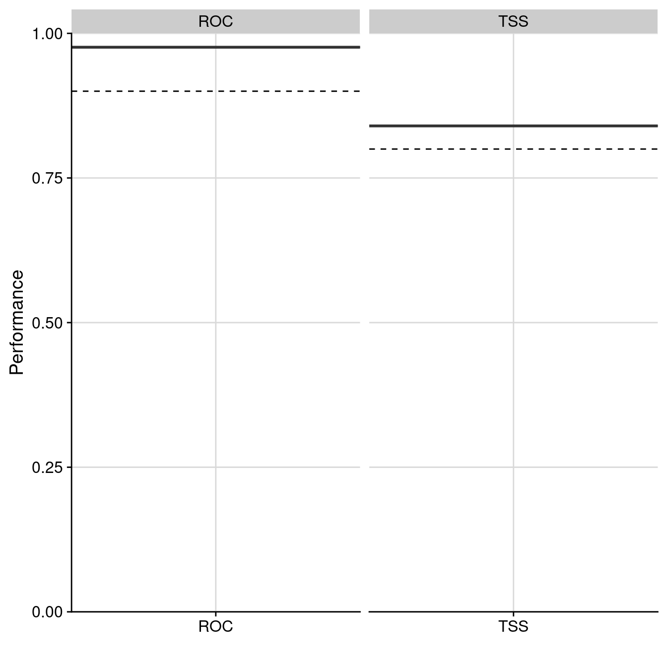 Figure 60.11: Évaluation de la qualité du modèle d’ensemble : Aire sous la courbe de ROC & True Skill Statistic.