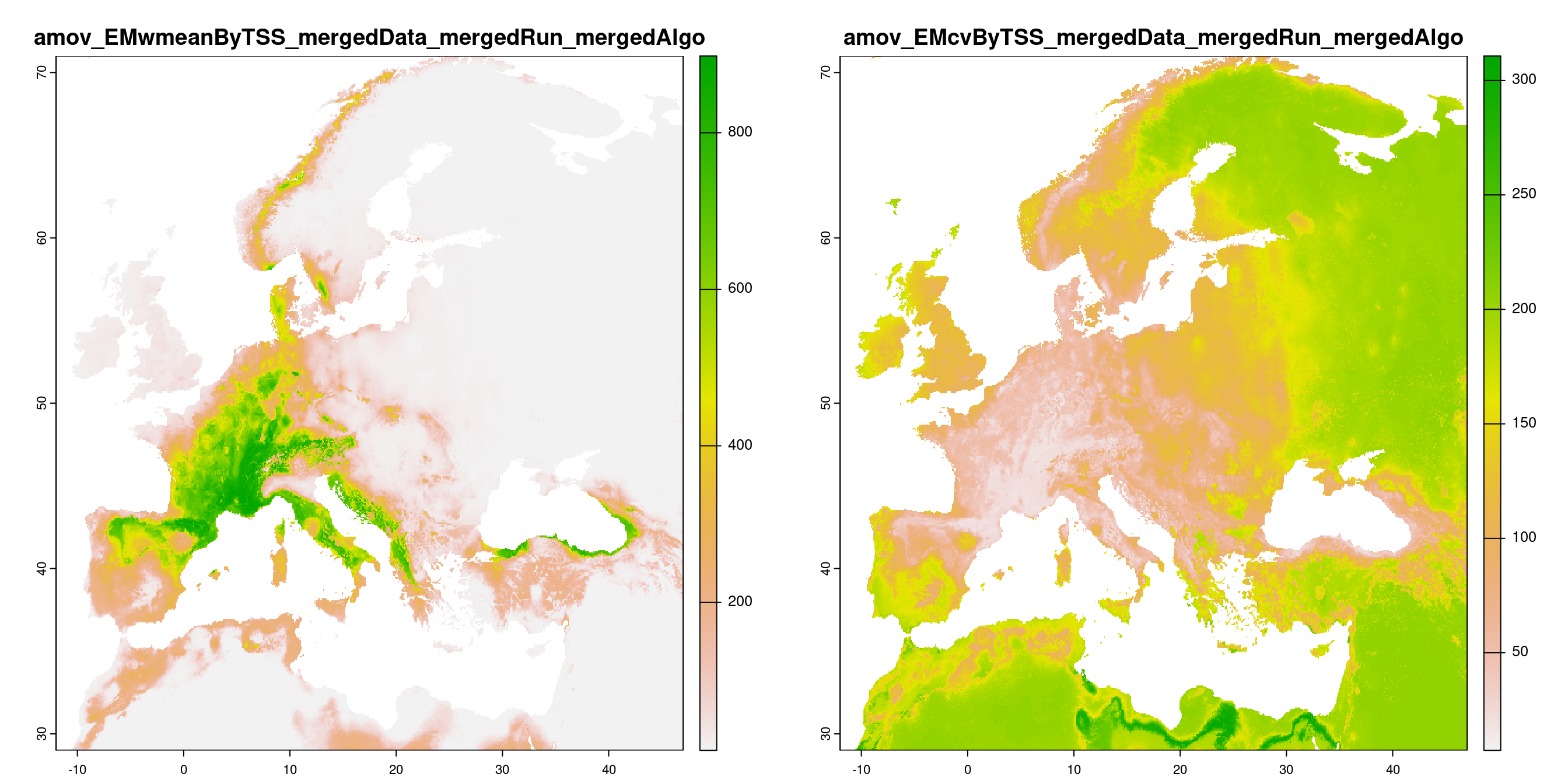Figure 115.16: A) Projection de la distribution potentielle contemporaine (modèle d’ensemble) ; B) Incertitude associée à la projection.