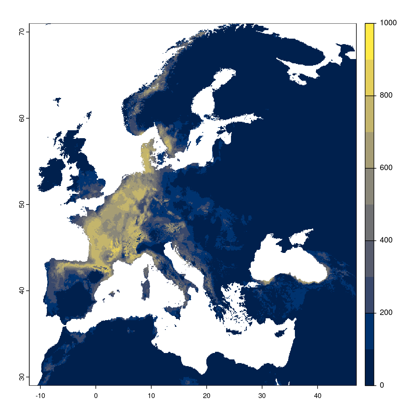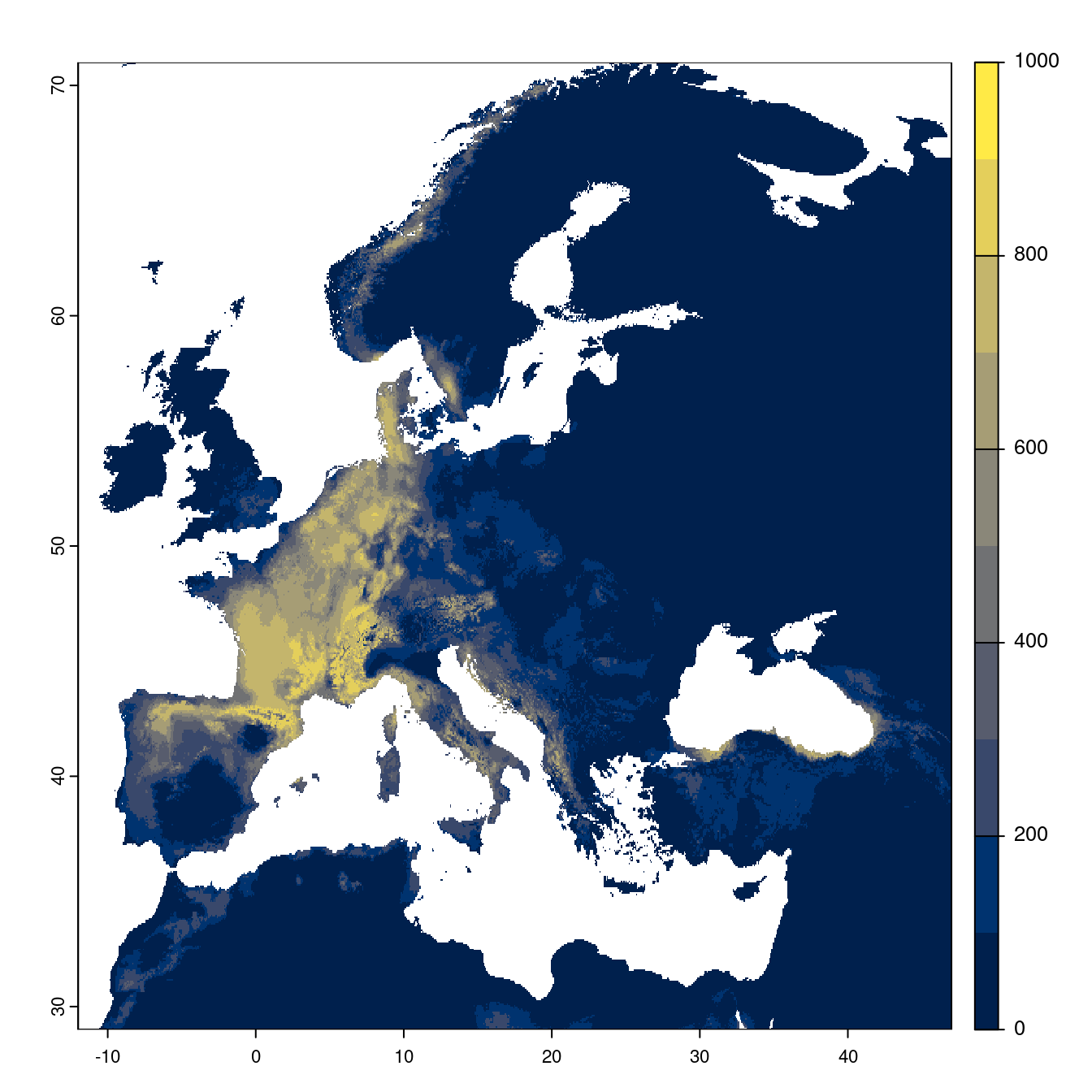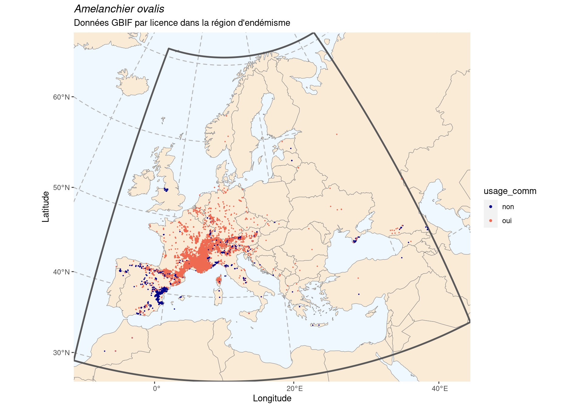 On évalue la proportion d’occurrences dans chaque région, en utilisant les 3 masques créés précédemment. Si on a au moins 50 % des occurrences dans une région, on peut continuer en travaillant uniquement sur ces données. Sinon, on vérifie qu’au moins 67 % des données tombent dans l’ensemble des régions, et on prend la région la plus représentée. Au final, s’il s’agit d’une espèce endémique d’Europe, on n’a pas besoin de manipulation supplémentaire.