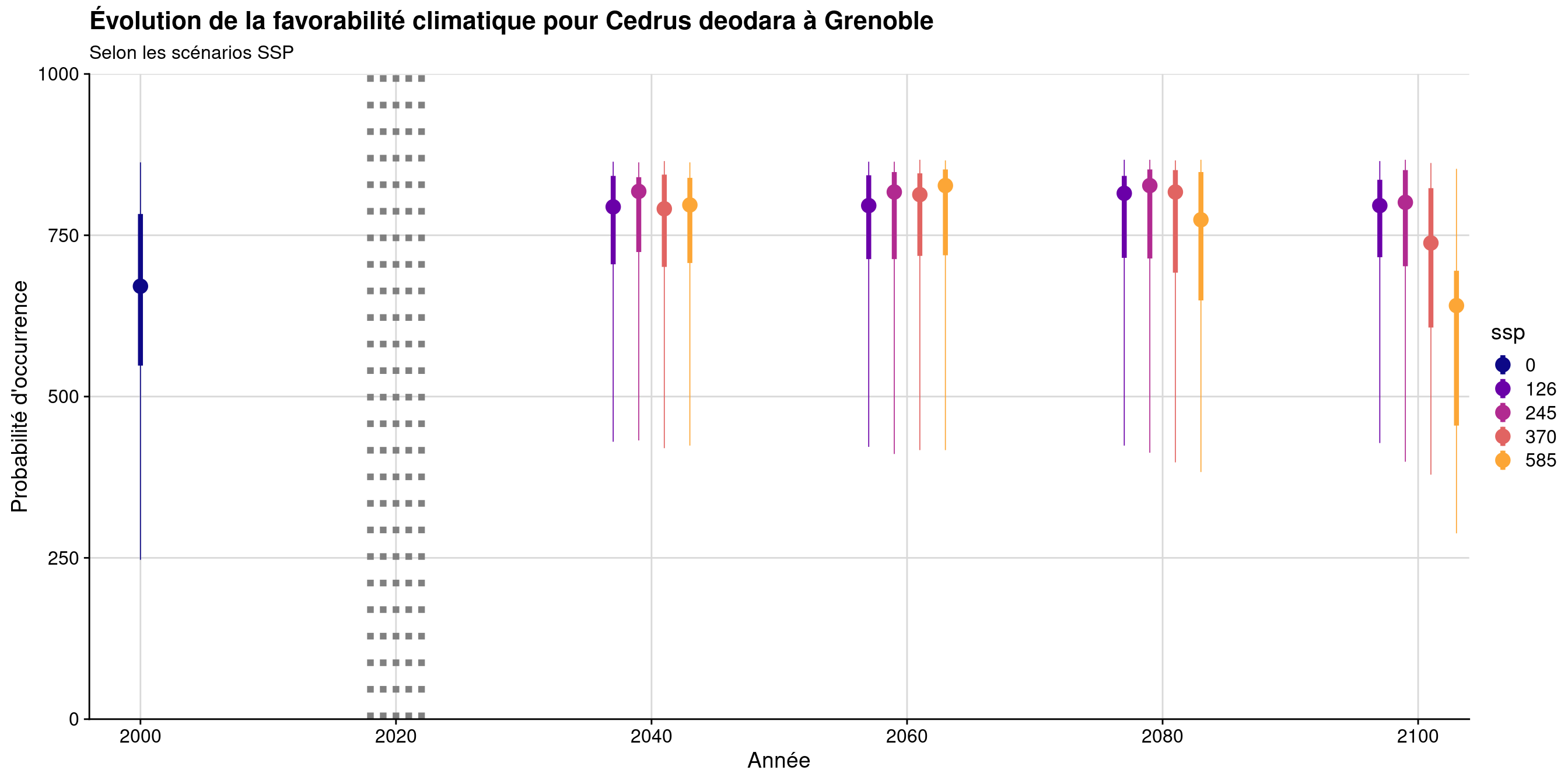 Figure 124.25: Projection des distributions potentielles contemporaine et futures jusqu’à l’horizon 2100 sous le scénario SSP5-8.5 (modèle d’ensemble, GCM IPSL).