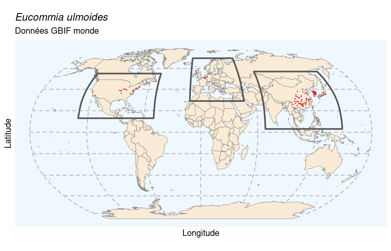 Figure 248.1: Occurrences de Eucommia ulmoides dans le monde.