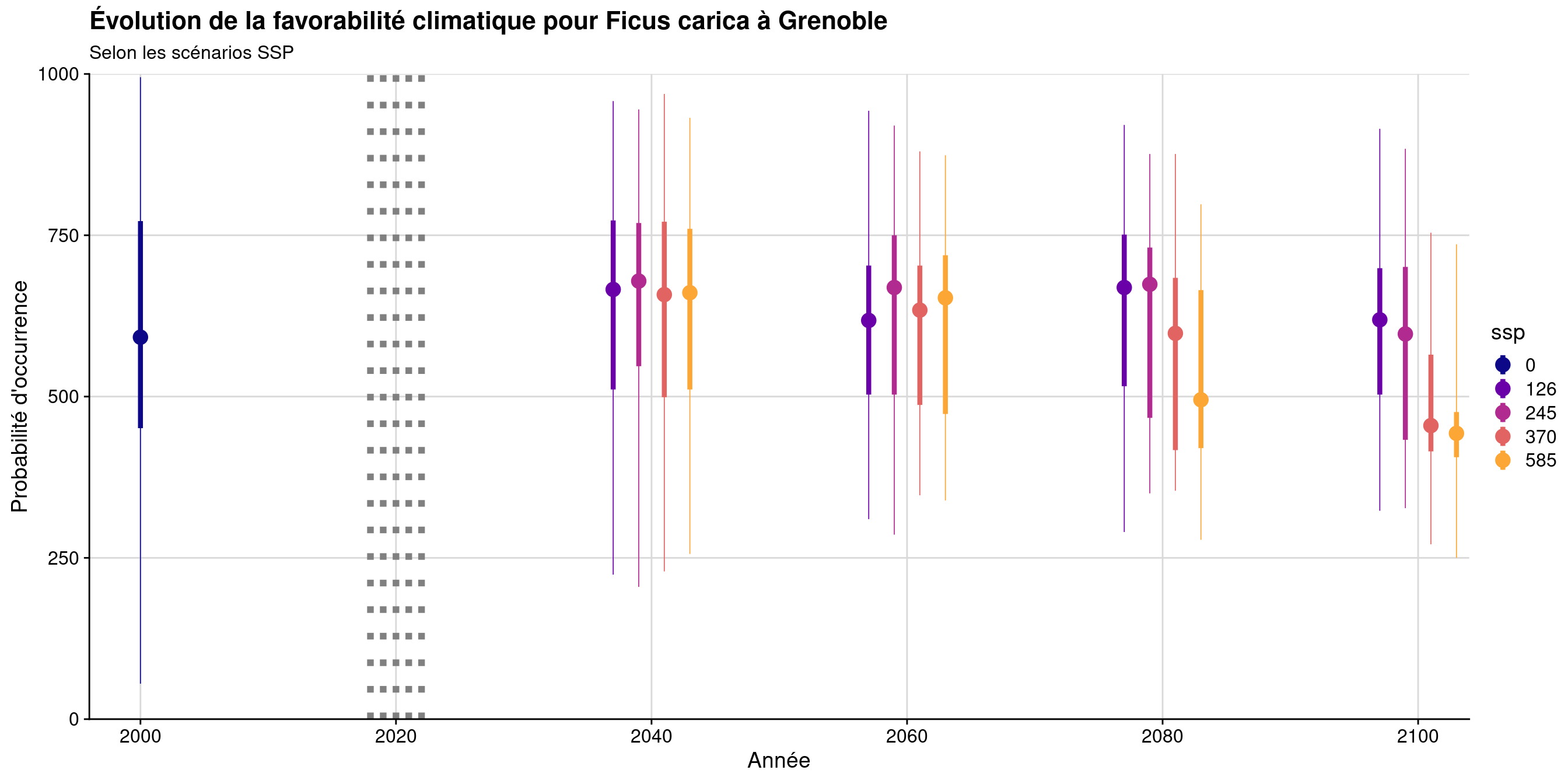Figure 136.28: Évolution de la favorabilité climatique au cours du XXIème siècle. Le point représente la médiane sur l’étendue de la métropole (i.e. tous les pixels de la carte) ; le trait gras représente 50 % des données intermédiaires (espace inter-quartile) ; le trait fin représente le reste des données du minimum au maximum.
