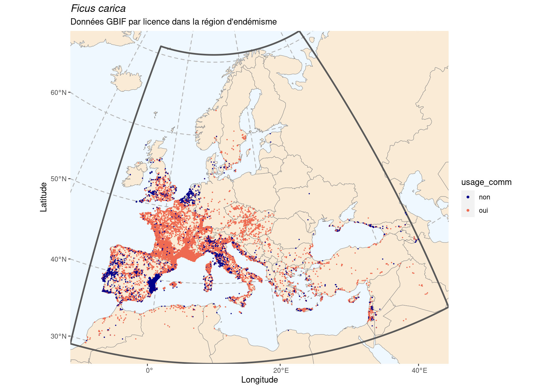 Figure 136.3: Occurrence de Ficus carica dans la région d’endémisme, selon la licence : CC BY-NC en bleu ; CC0 et CC BY en orange.