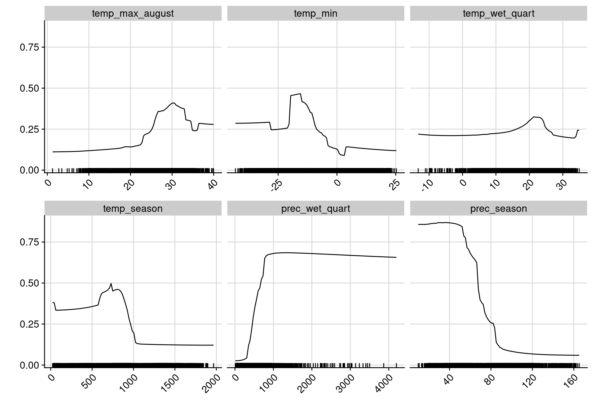Figure 88.13: Courbes de réponse de chaque variable climatique dans le modèle d’ensemble.