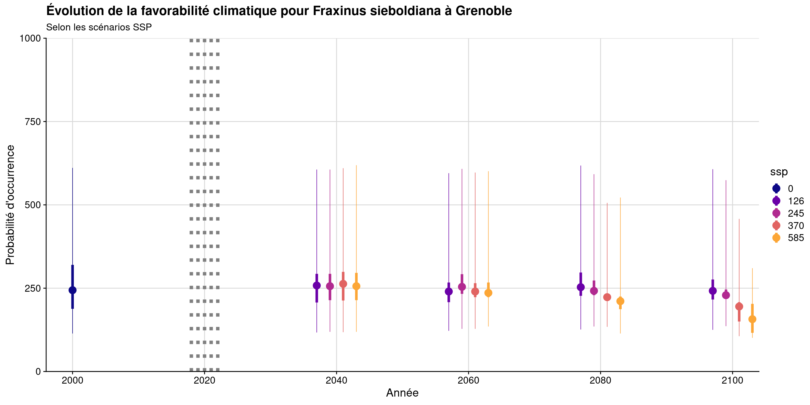 Figure 88.28: Évolution de la favorabilité climatique au cours du XXIème siècle. Le point représente la médiane sur l’étendue de la métropole (i.e. tous les pixels de la carte) ; le trait gras représente 50 % des données intermédiaires (espace inter-quartile) ; le trait fin représente le reste des données du minimum au maximum.