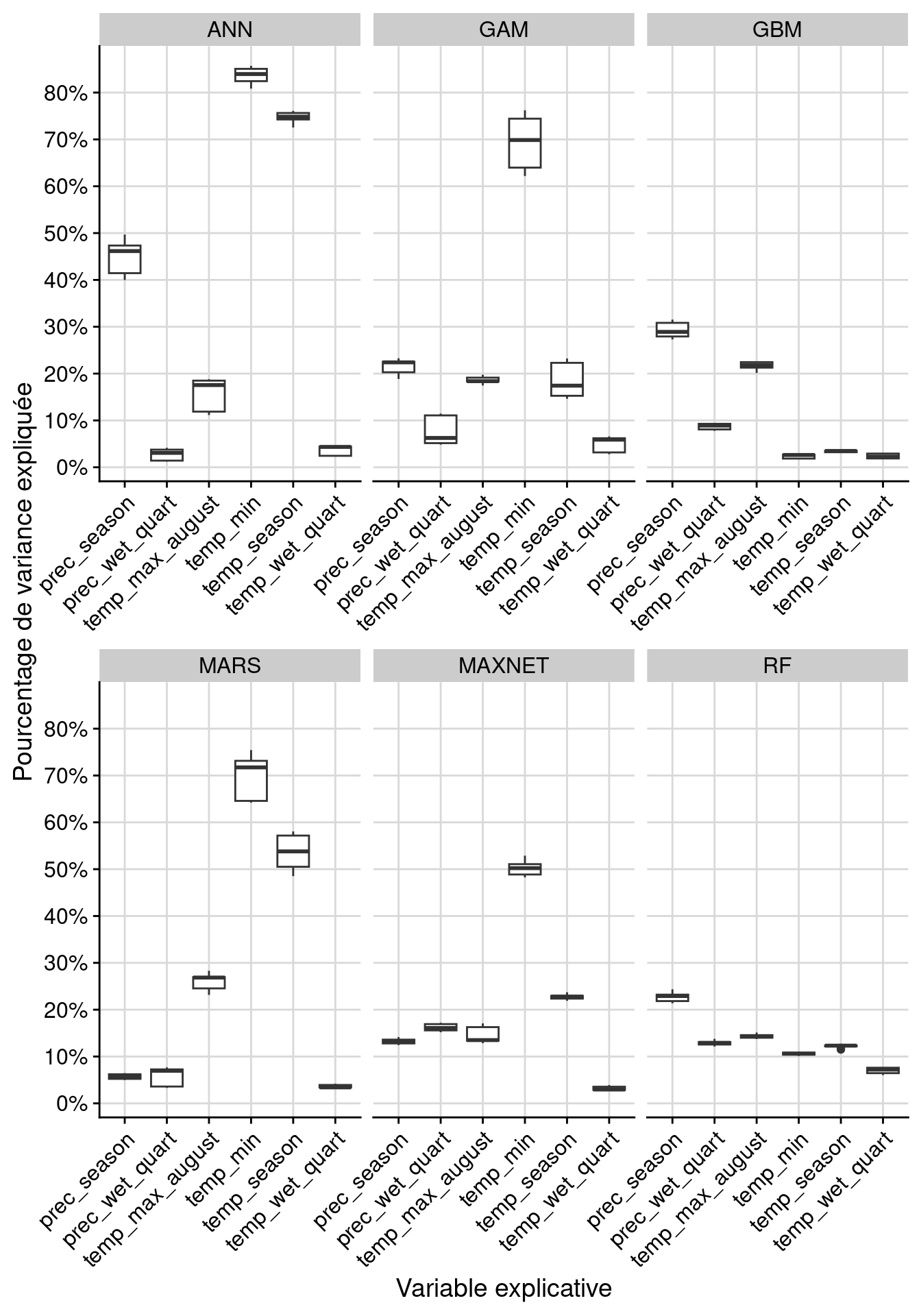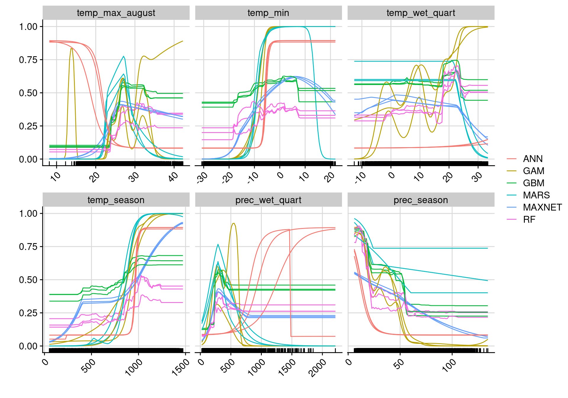 Figure 252.13: Courbes de réponse de chaque variable climatique dans le modèle d’ensemble.