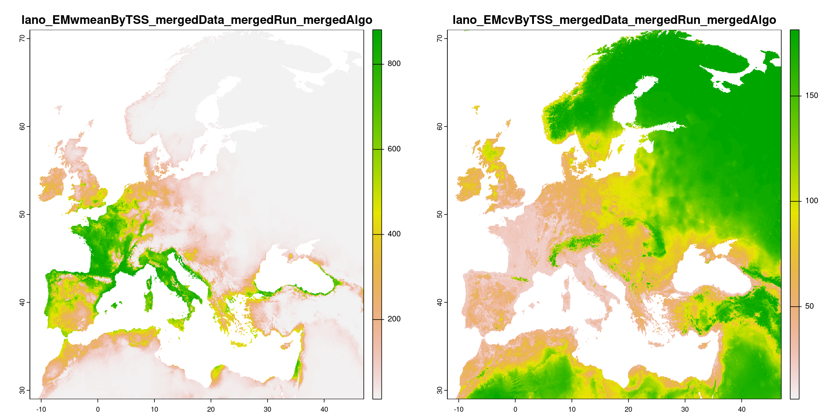 Figure 253.16: A) Projection de la distribution potentielle contemporaine (modèle d’ensemble) ; B) Incertitude associée à la projection.
