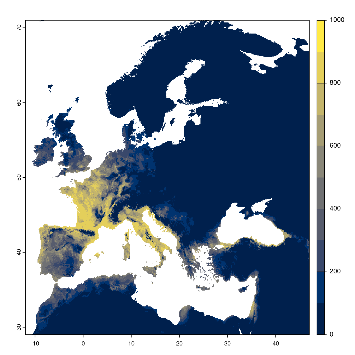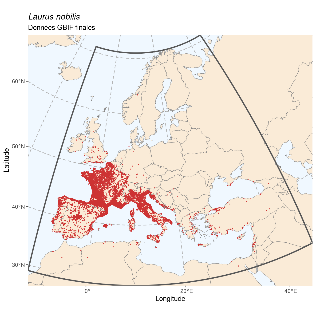 On évalue la proportion d’occurrences dans chaque région, en utilisant les 3 masques créés précédemment. Si on a au moins 50 % des occurrences dans une région, on peut continuer en travaillant uniquement sur ces données. Sinon, on vérifie qu’au moins 67 % des données tombent dans l’ensemble des régions, et on prend la région la plus représentée. Au final, s’il s’agit d’une espèce endémique d’Europe, on n’a pas besoin de manipulation supplémentaire.