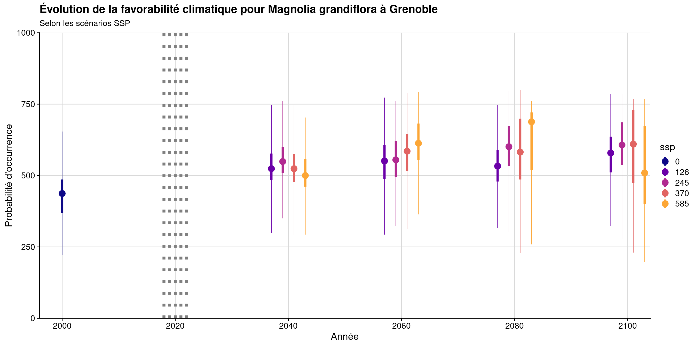Figure 68.26: Projection des distributions potentielles contemporaine et futures jusqu’à l’horizon 2100 sous le scénario SSP5-8.5 (modèle d’ensemble, GCM IPSL).