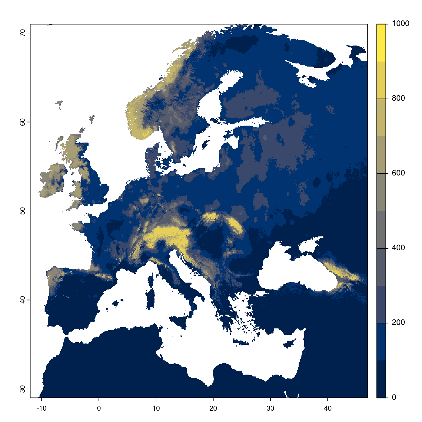 On évalue la proportion d’occurrences dans chaque région, en utilisant les 3 masques créés précédemment. Si on a au moins 50 % des occurrences dans une région, on peut continuer en travaillant uniquement sur ces données. Sinon, on vérifie qu’au moins 67 % des données tombent dans l’ensemble des régions, et on prend la région la plus représentée. Au final, s’il s’agit d’une espèce endémique d’Europe, on n’a pas besoin de manipulation supplémentaire.