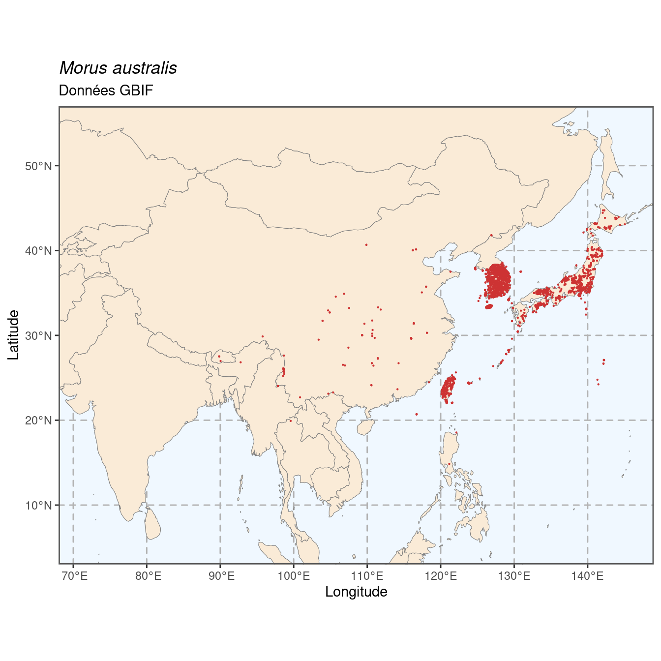 Figure 41.1: Occurrences de Morus australis dans le monde.