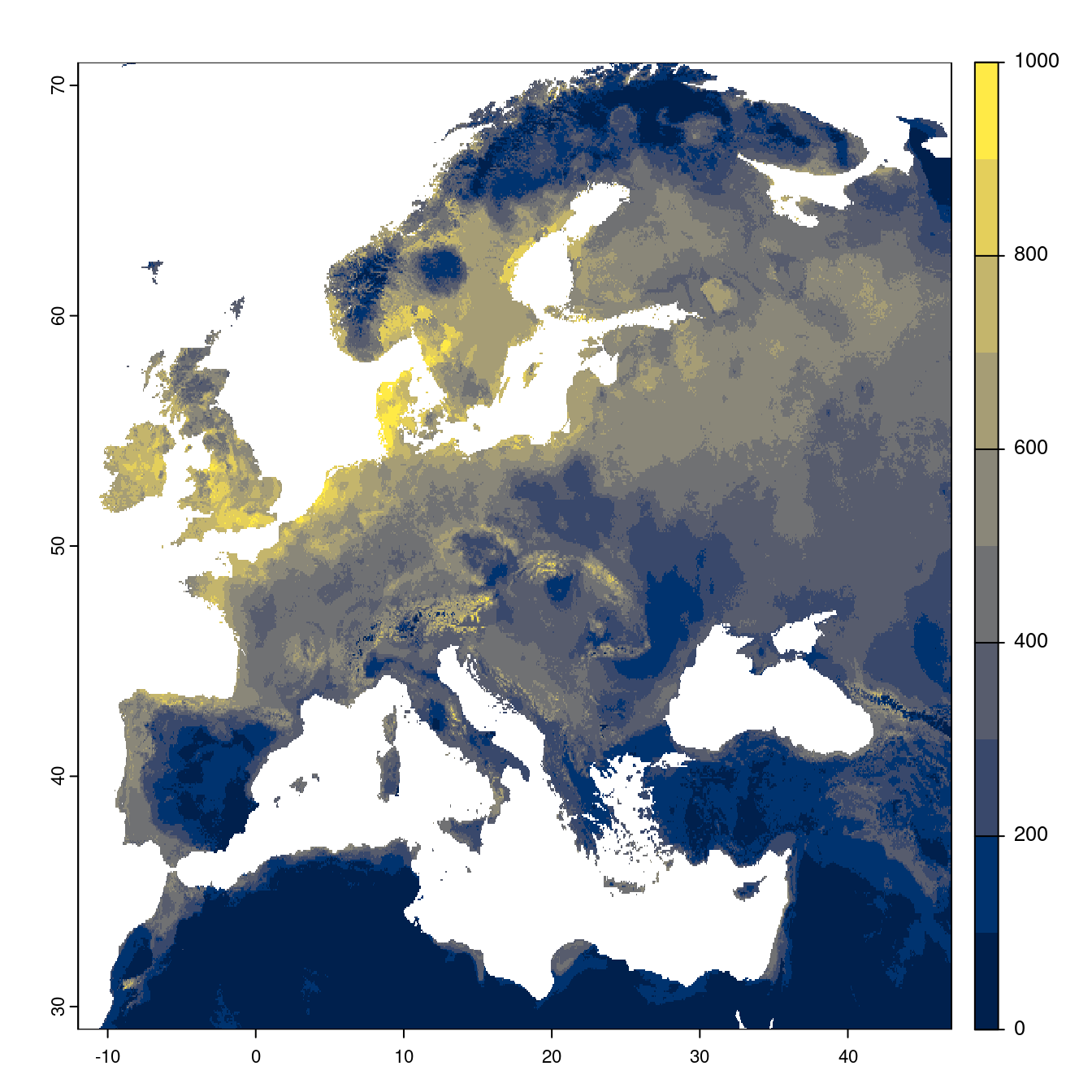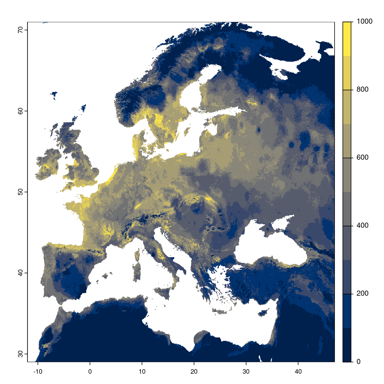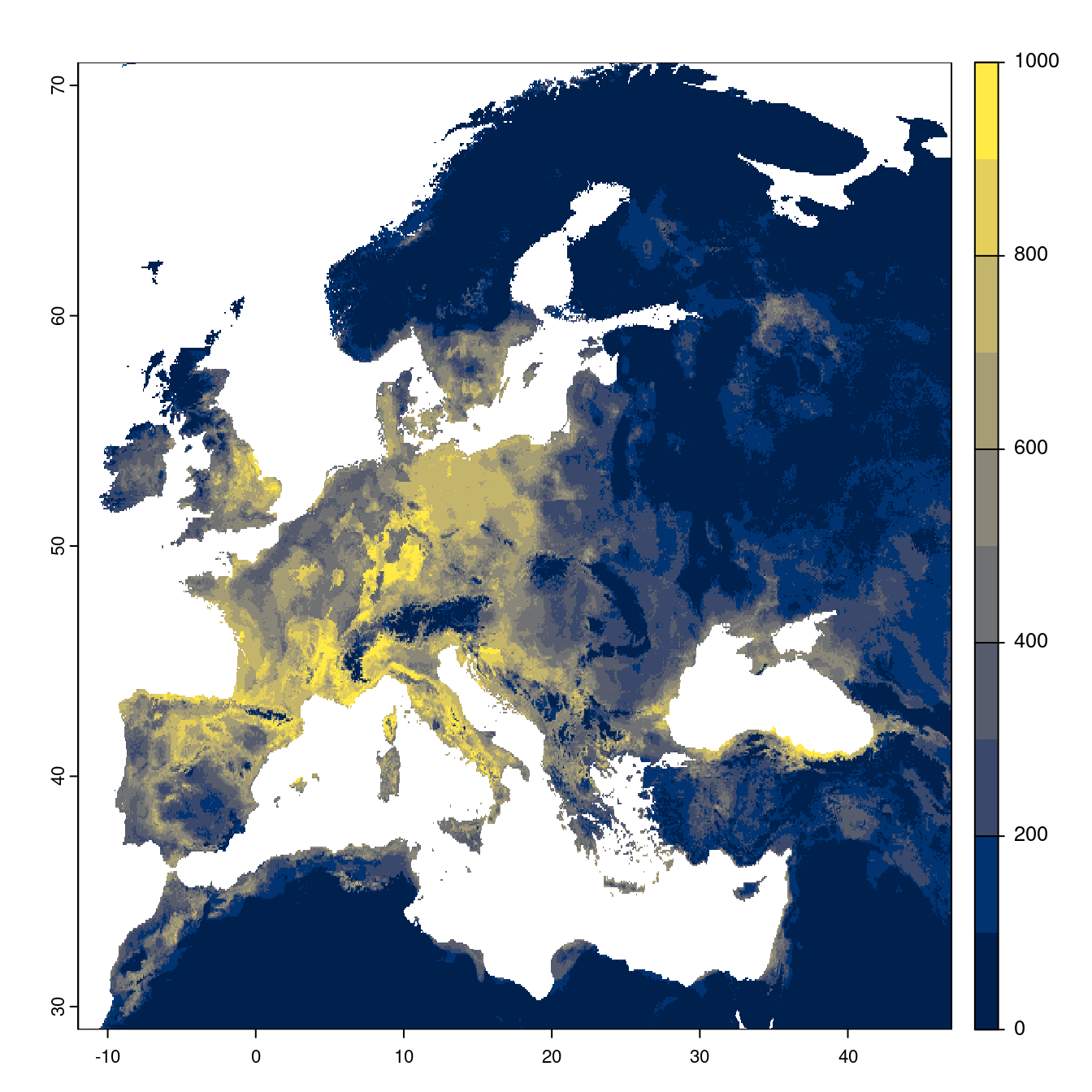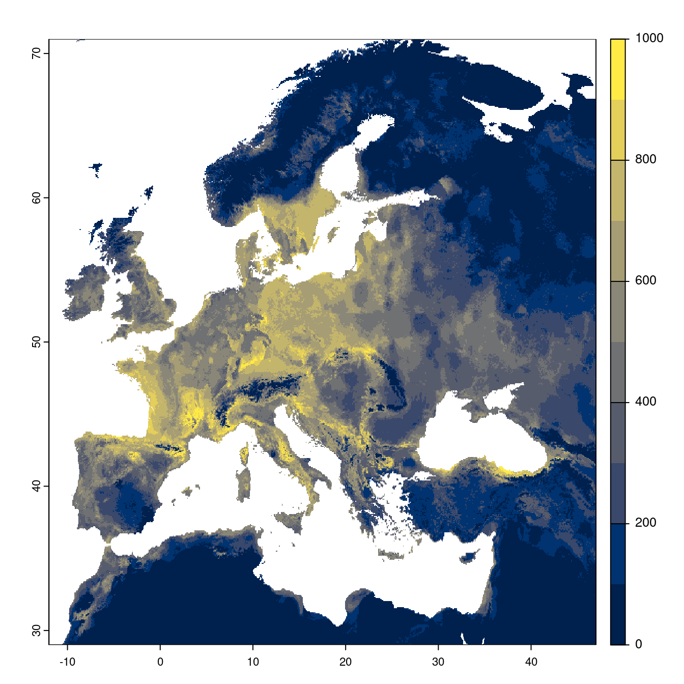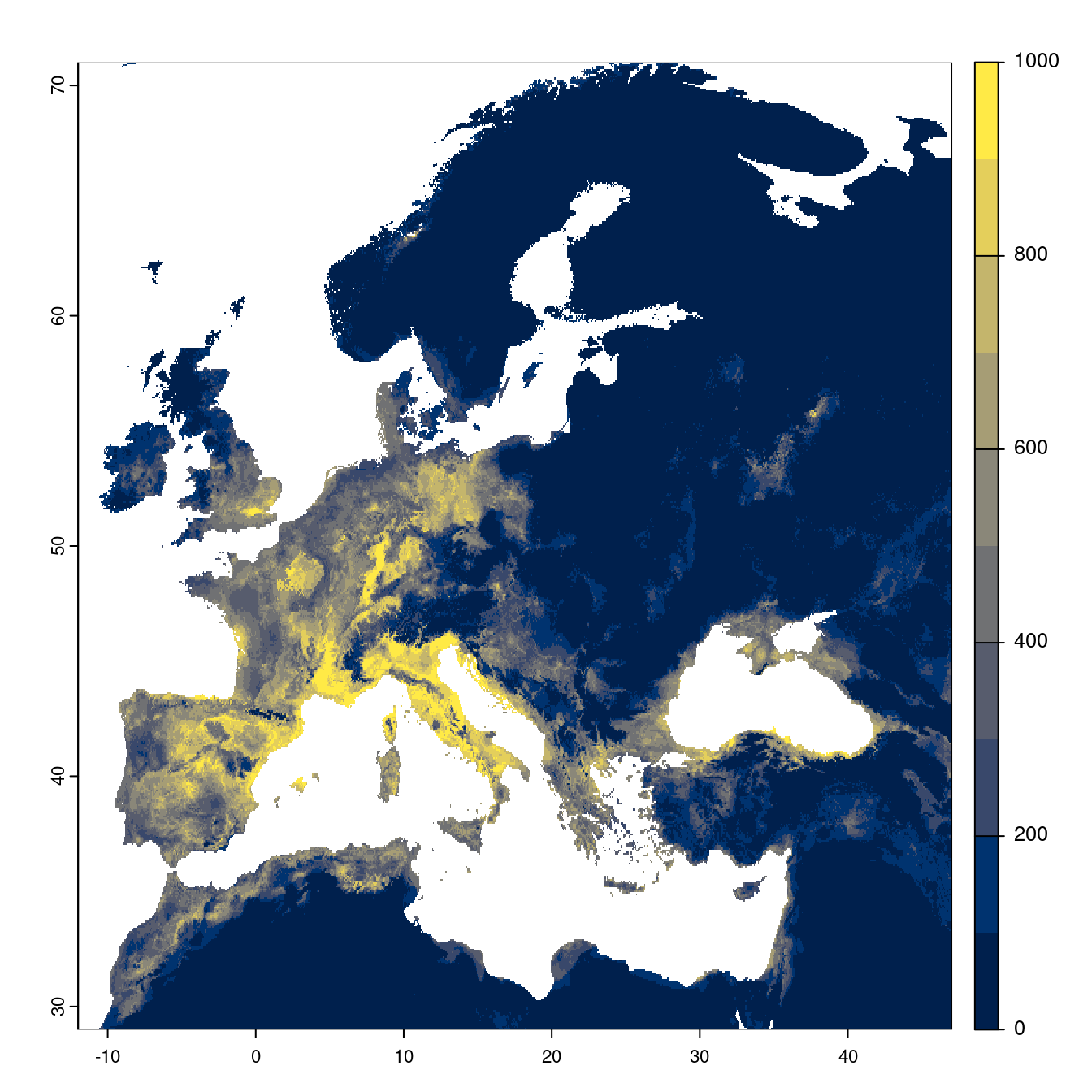 On évalue la proportion d’occurrences dans chaque région, en utilisant les 3 masques créés précédemment. Si on a au moins 50 % des occurrences dans une région, on peut continuer en travaillant uniquement sur ces données. Sinon, on vérifie qu’au moins 67 % des données tombent dans l’ensemble des régions, et on prend la région la plus représentée. Au final, s’il s’agit d’une espèce endémique d’Europe, on n’a pas besoin de manipulation supplémentaire.