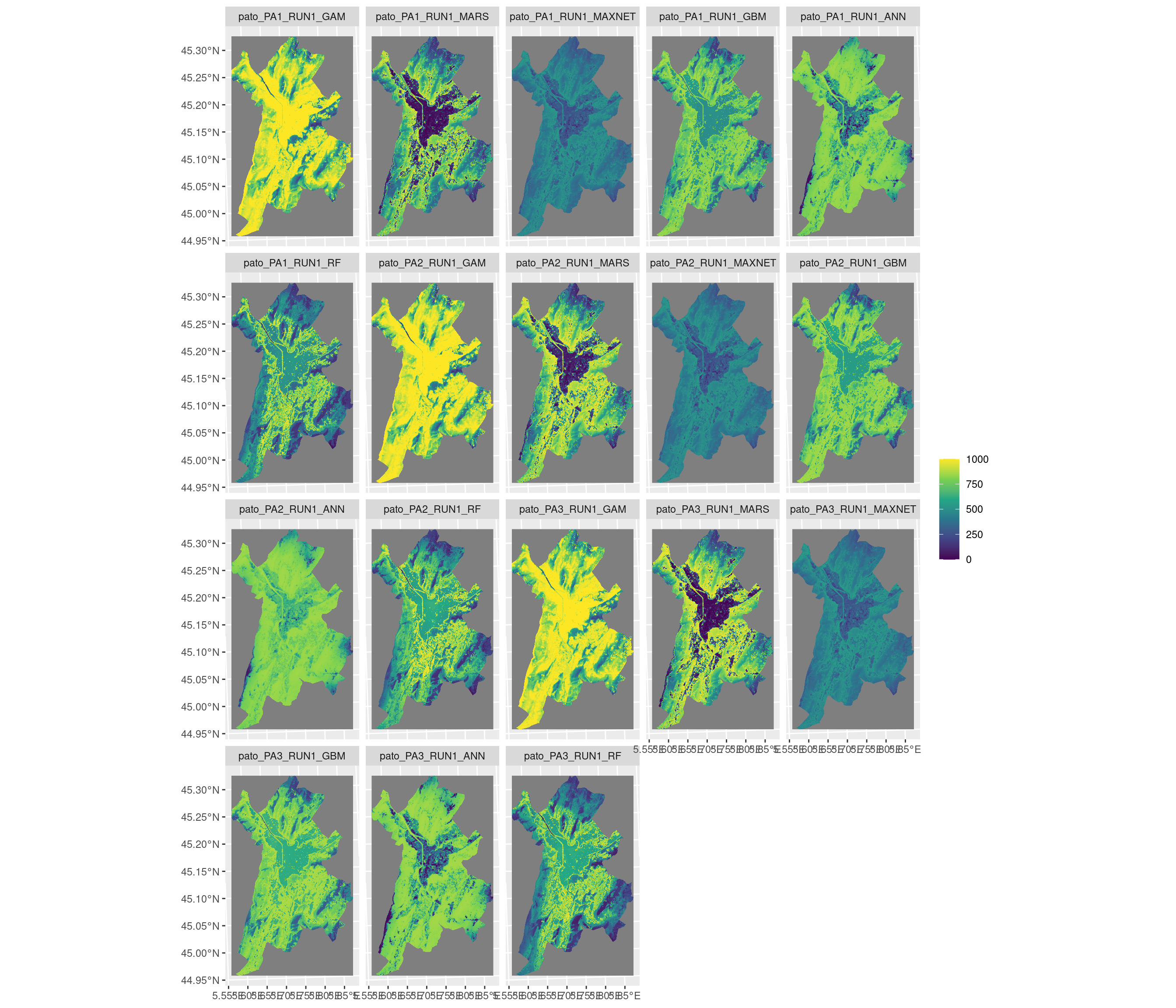 Figure 151.18: Projection de la distribution potentielle contemporaine sur la métropole de Grenoble, selon les 6 algorithmes et les 3 runs.