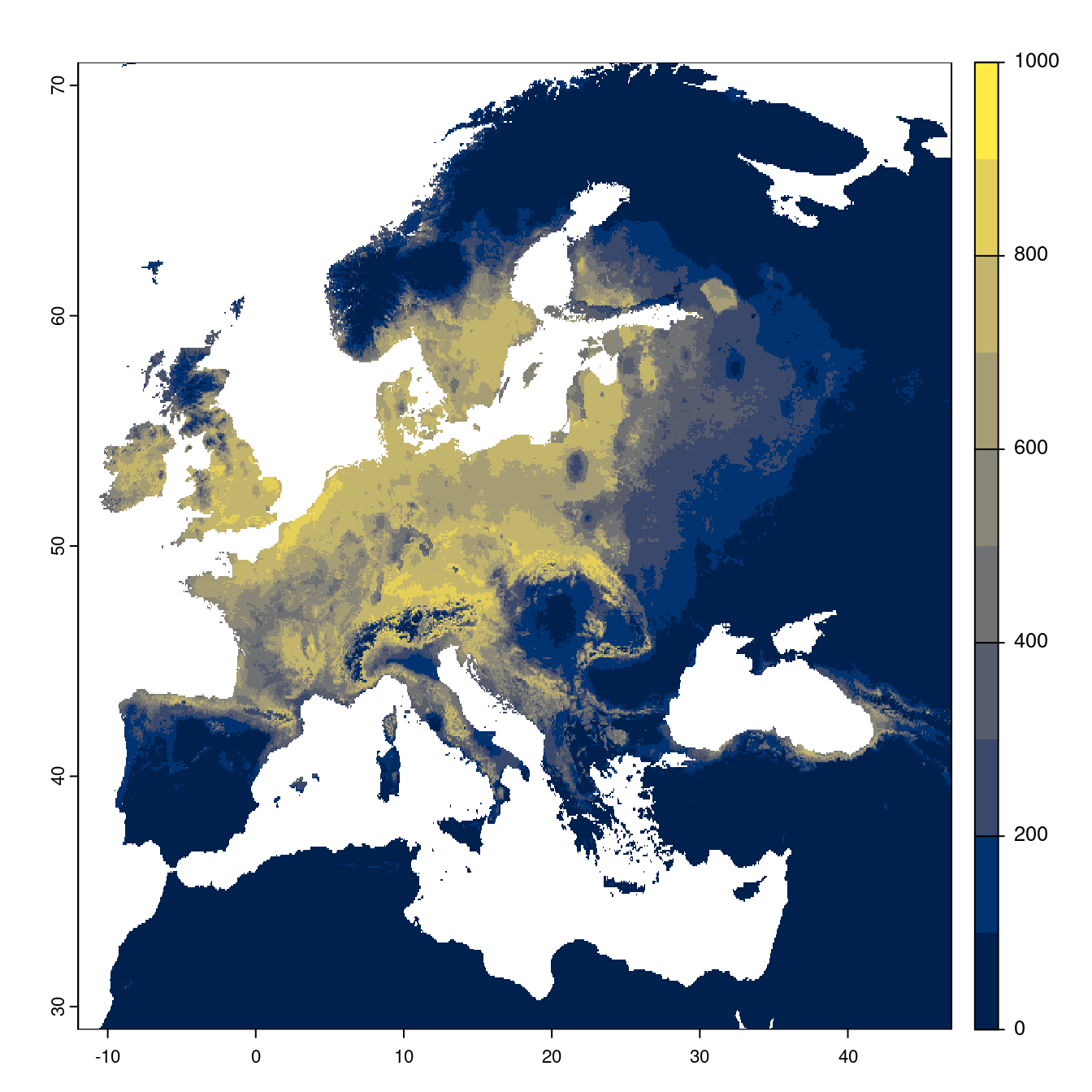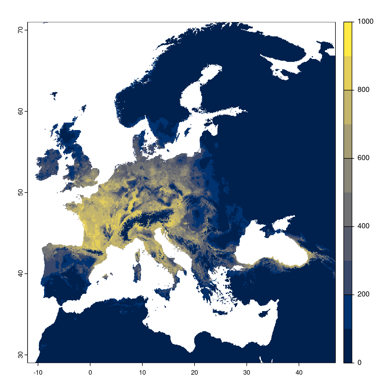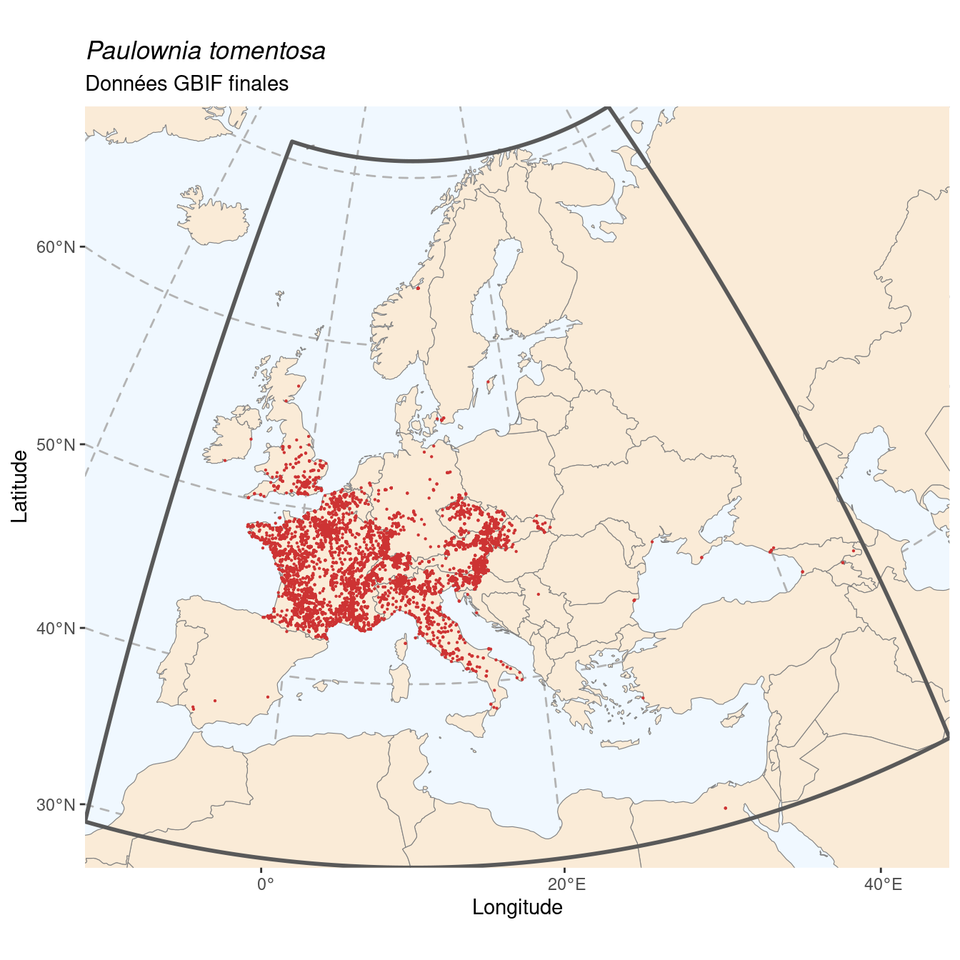 On évalue la proportion d’occurrences dans chaque région, en utilisant les 3 masques créés précédemment. Si on a au moins 50 % des occurrences dans une région, on peut continuer en travaillant uniquement sur ces données. Sinon, on vérifie qu’au moins 67 % des données tombent dans l’ensemble des régions, et on prend la région la plus représentée. Au final, s’il s’agit d’une espèce endémique d’Europe, on n’a pas besoin de manipulation supplémentaire.