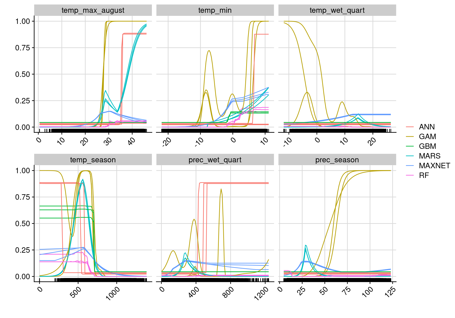 Figure 216.13: Courbes de réponse de chaque variable climatique dans le modèle d’ensemble.