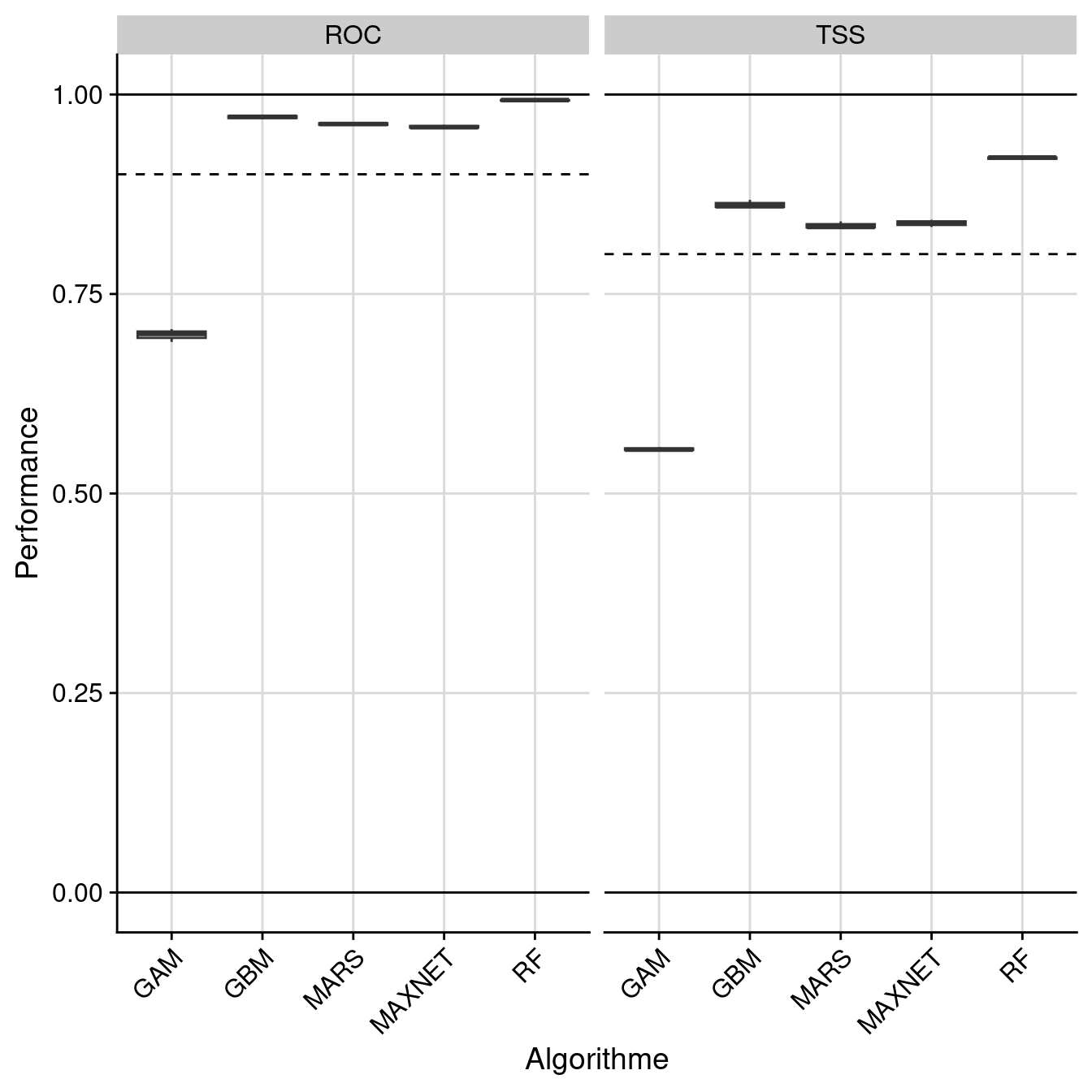 Figure 38.11: Évaluation de la qualité du modèle d’ensemble : Aire sous la courbe de ROC & True Skill Statistic.