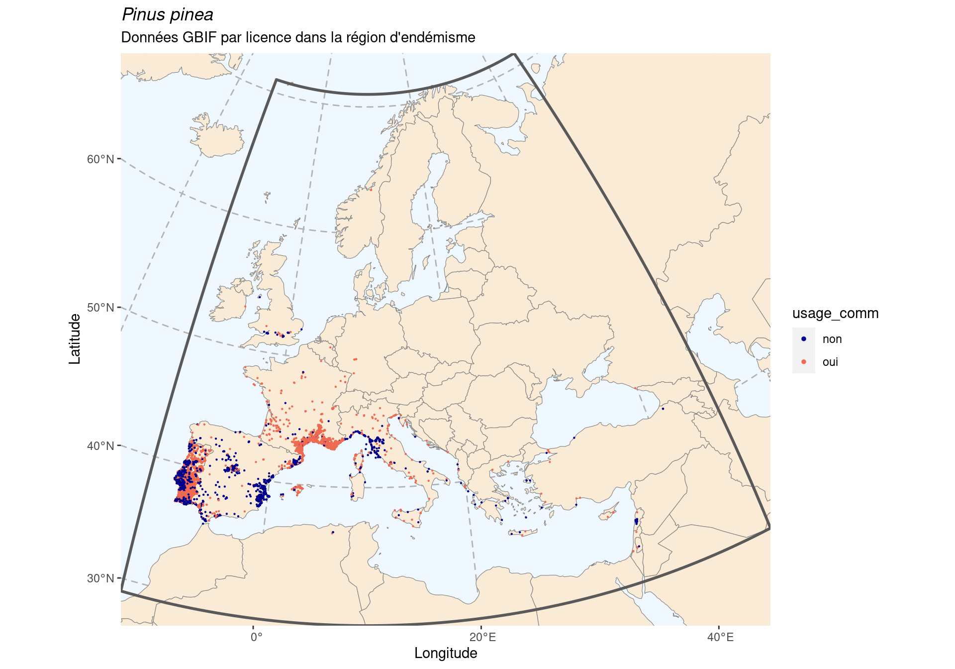 Figure 98.3: Occurrence de Pinus pinea dans la région d’endémisme, selon la licence : CC BY-NC en bleu ; CC0 et CC BY en orange.