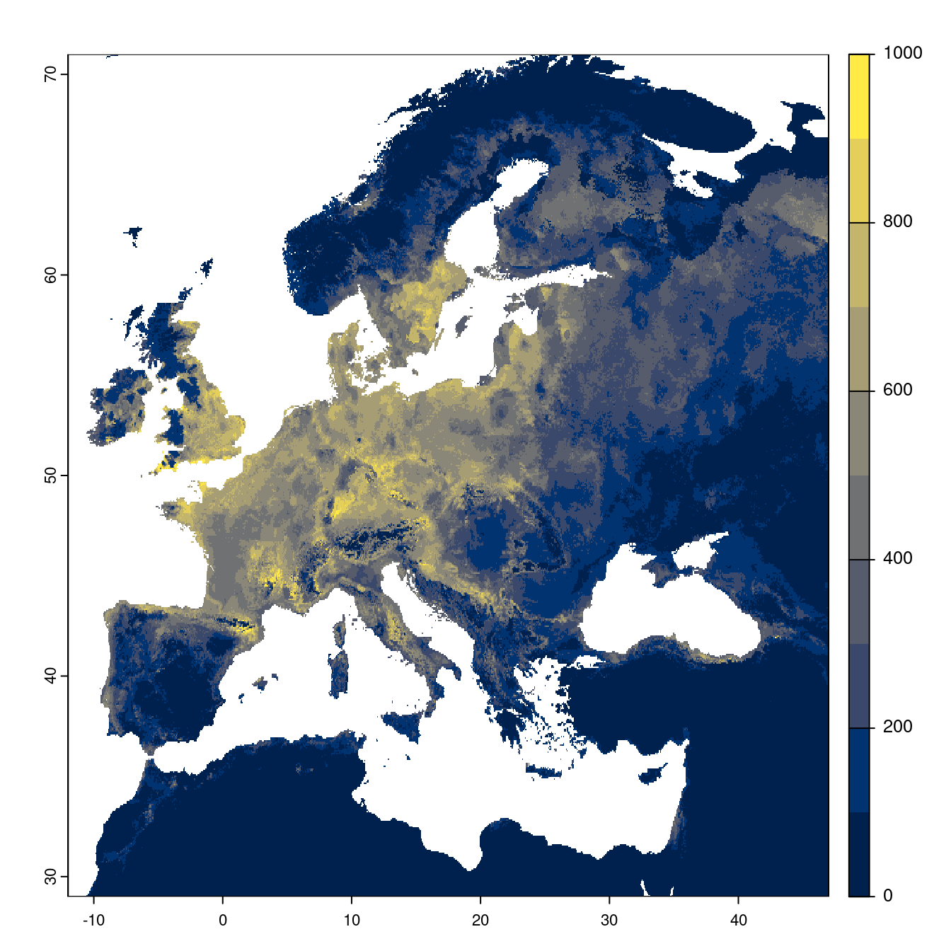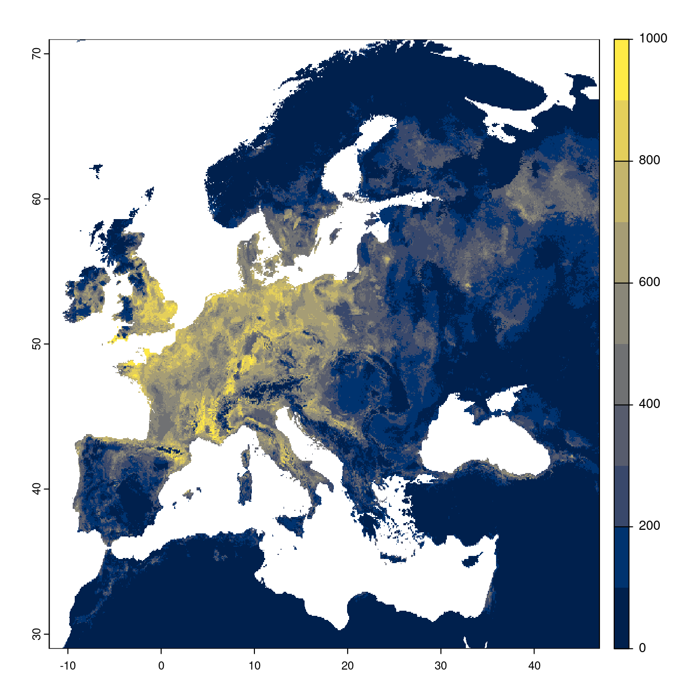 On évalue la proportion d’occurrences dans chaque région, en utilisant les 3 masques créés précédemment. Si on a au moins 50 % des occurrences dans une région, on peut continuer en travaillant uniquement sur ces données. Sinon, on vérifie qu’au moins 67 % des données tombent dans l’ensemble des régions, et on prend la région la plus représentée. Au final, s’il s’agit d’une espèce endémique d’Europe, on n’a pas besoin de manipulation supplémentaire.