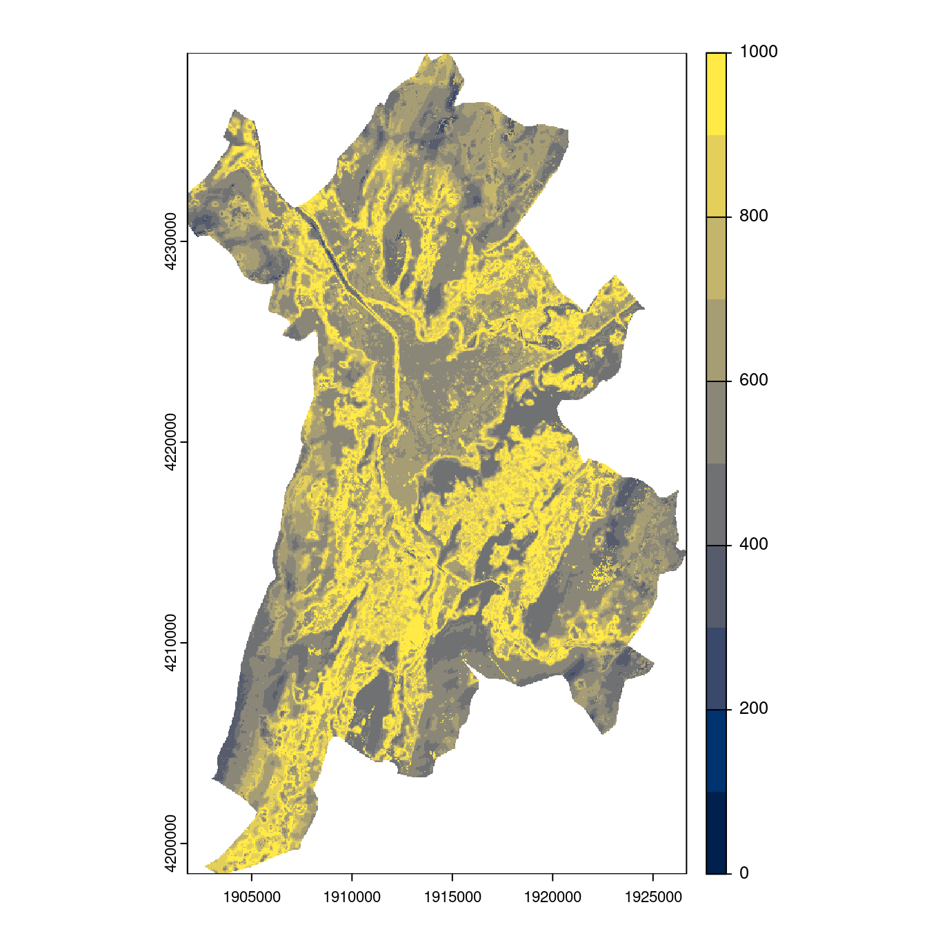 On obtient pour la métrique TSS une carte unique de moyenne pondérée sur les algorithmes et sur les jeux de pseudo-absences.