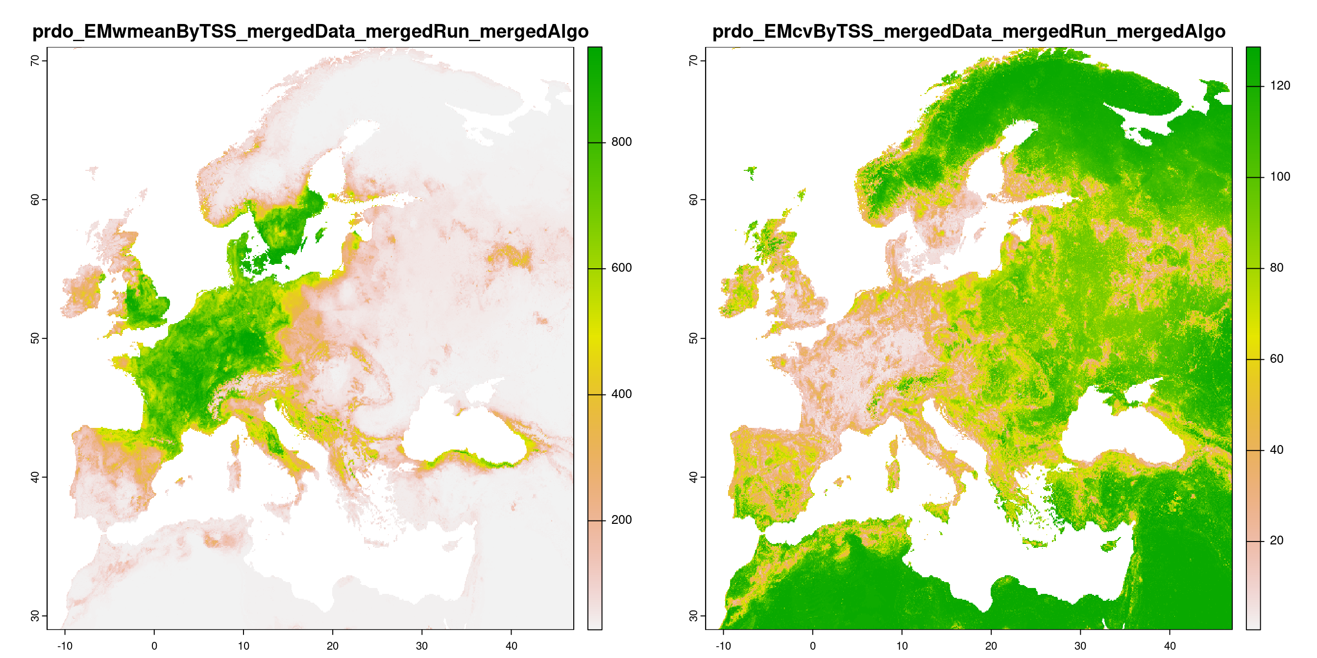 Figure 69.16: A) Projection de la distribution potentielle contemporaine (modèle d’ensemble) ; B) Incertitude associée à la projection.