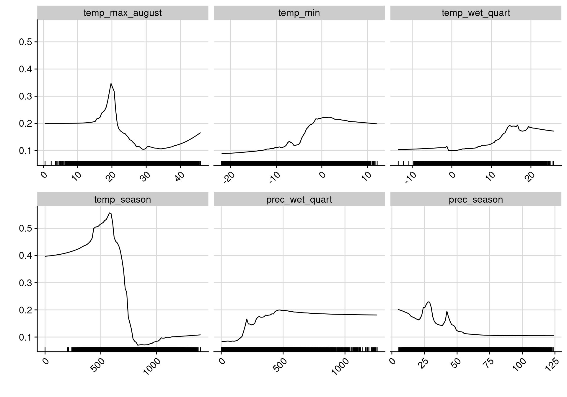 Figure 69.13: Courbes de réponse de chaque variable climatique dans le modèle d’ensemble.