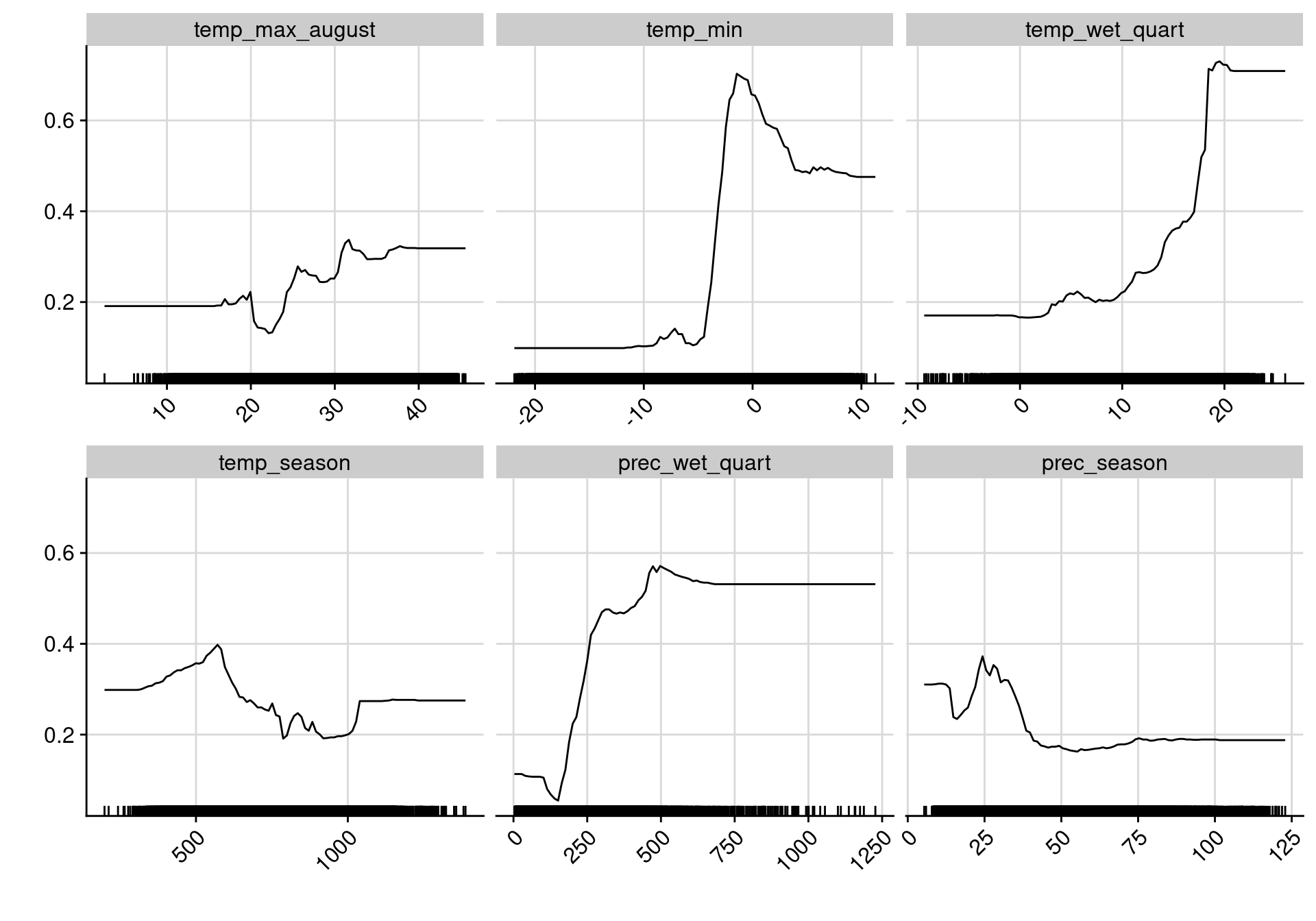 Figure 93.13: Courbes de réponse de chaque variable climatique dans le modèle d’ensemble.