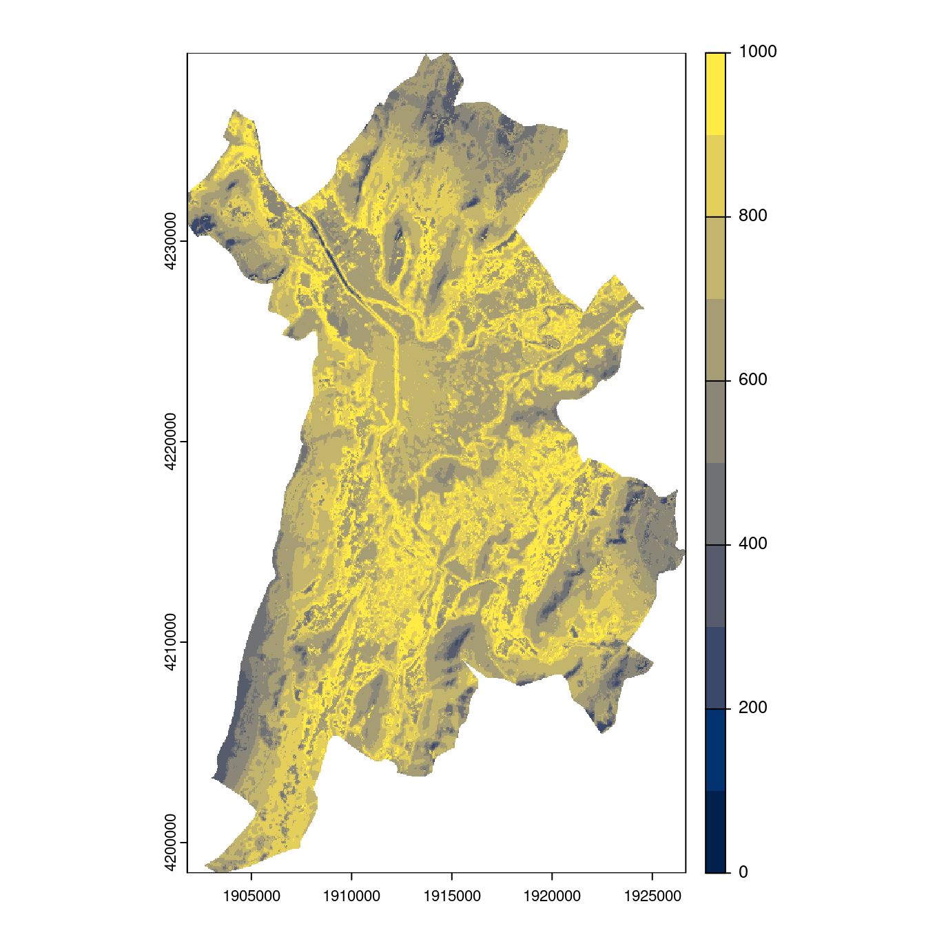 On obtient pour la métrique TSS une carte unique de moyenne pondérée sur les algorithmes et sur les jeux de pseudo-absences.