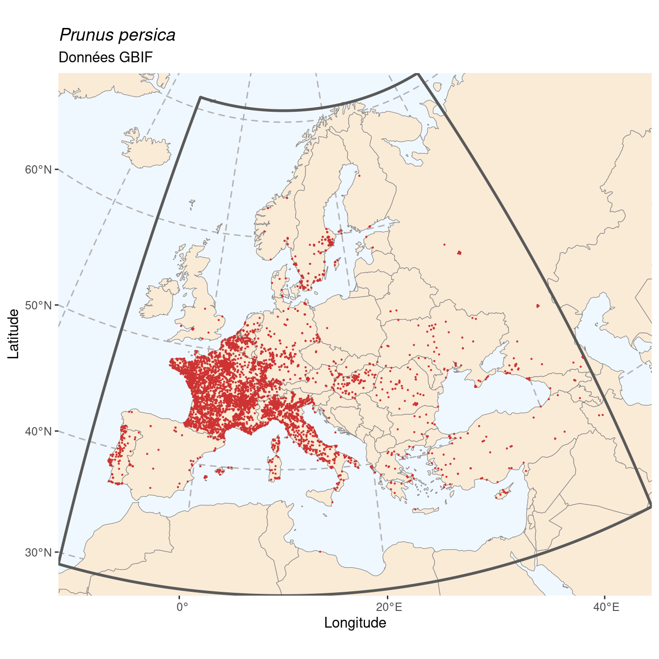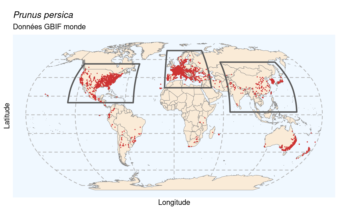Figure 93.1: Occurrences de Prunus persica dans le monde.