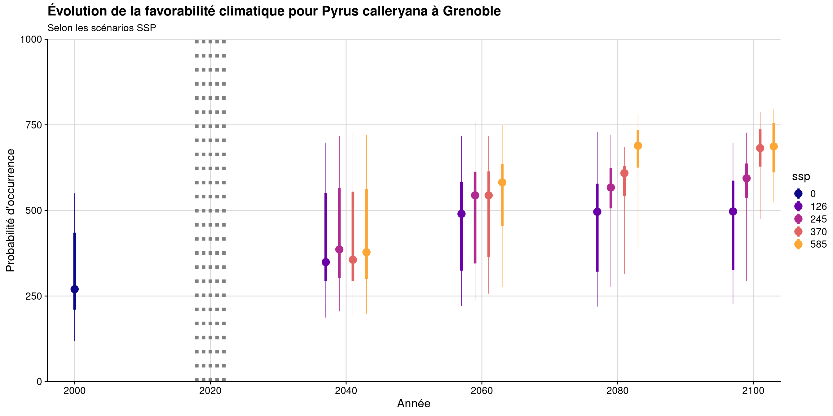 Figure 7.28: Évolution de la favorabilité climatique au cours du XXIème siècle. Le point représente la médiane sur l’étendue de la métropole (i.e. tous les pixels de la carte) ; le trait gras représente 50 % des données intermédiaires (espace inter-quartile) ; le trait fin représente le reste des données du minimum au maximum.