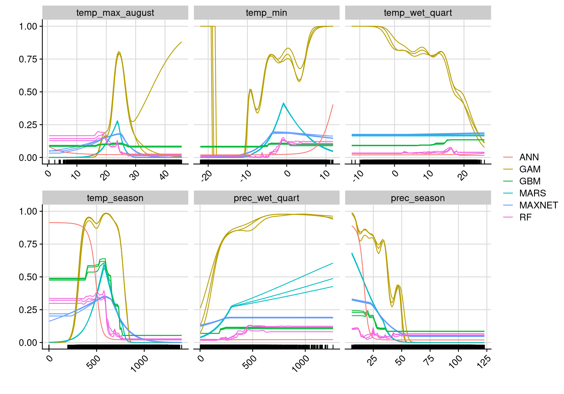 Figure 22.13: Courbes de réponse de chaque variable climatique dans le modèle d’ensemble.