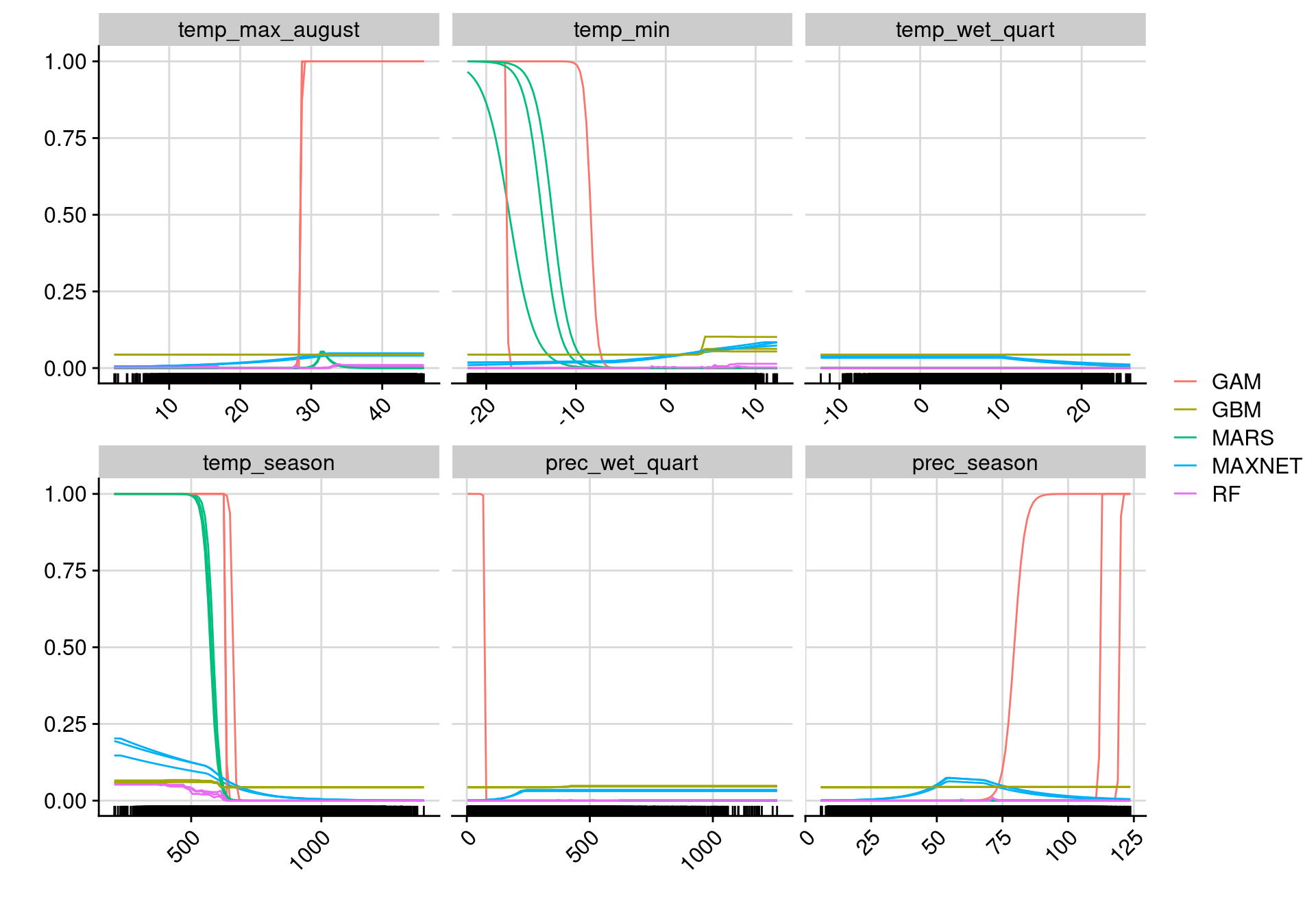 Figure 227.13: Courbes de réponse de chaque variable climatique dans le modèle d’ensemble.