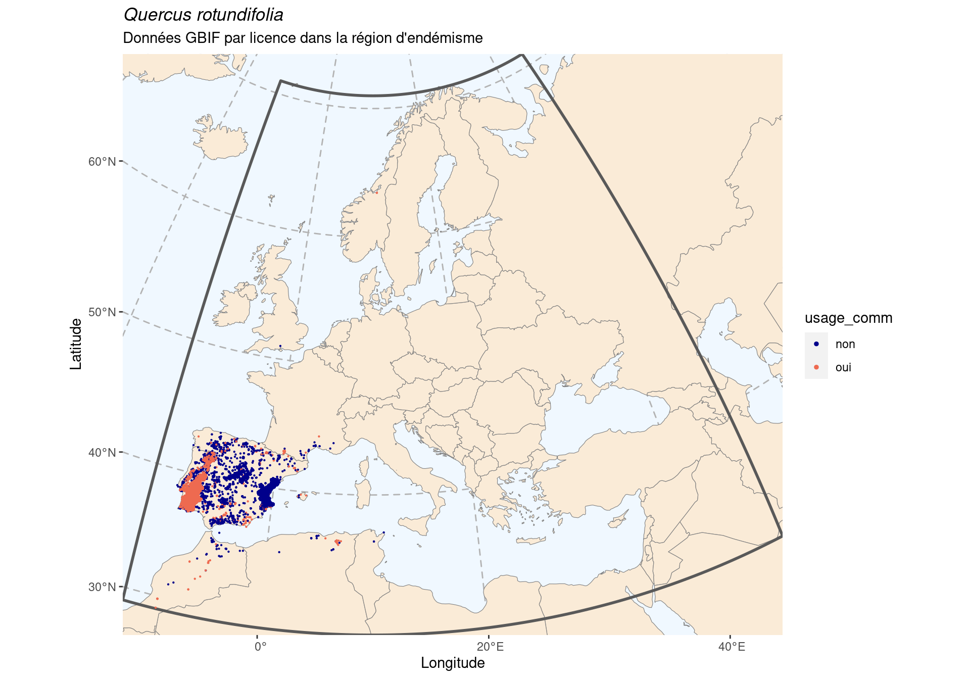 Figure 227.3: Occurrence de Quercus rotundifolia dans la région d’endémisme, selon la licence : CC BY-NC en bleu ; CC0 et CC BY en orange.