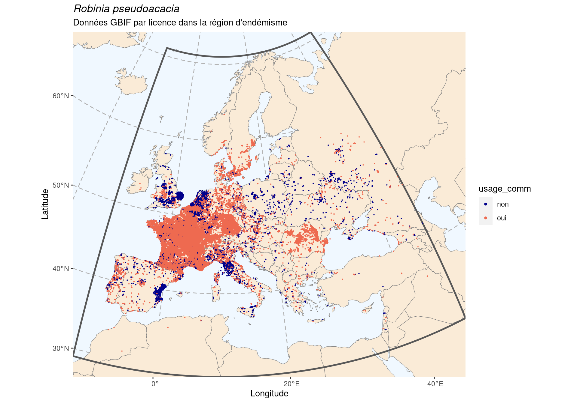 Figure 80.3: Occurrence de Robinia pseudoacacia dans la région d’endémisme, selon la licence : CC BY-NC en bleu ; CC0 et CC BY en orange.