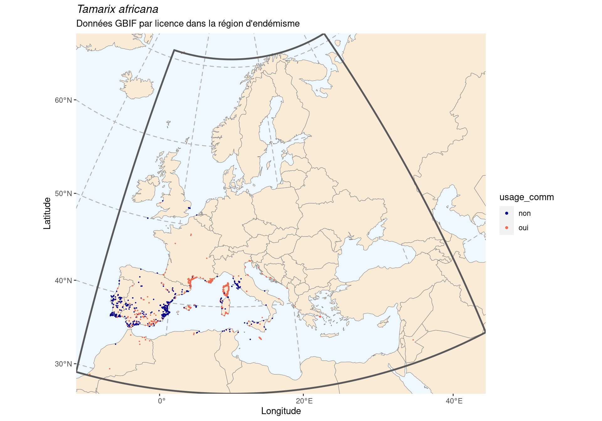 Figure 230.3: Occurrence de Tamarix africana dans la région d’endémisme, selon la licence : CC BY-NC en bleu ; CC0 et CC BY en orange.
