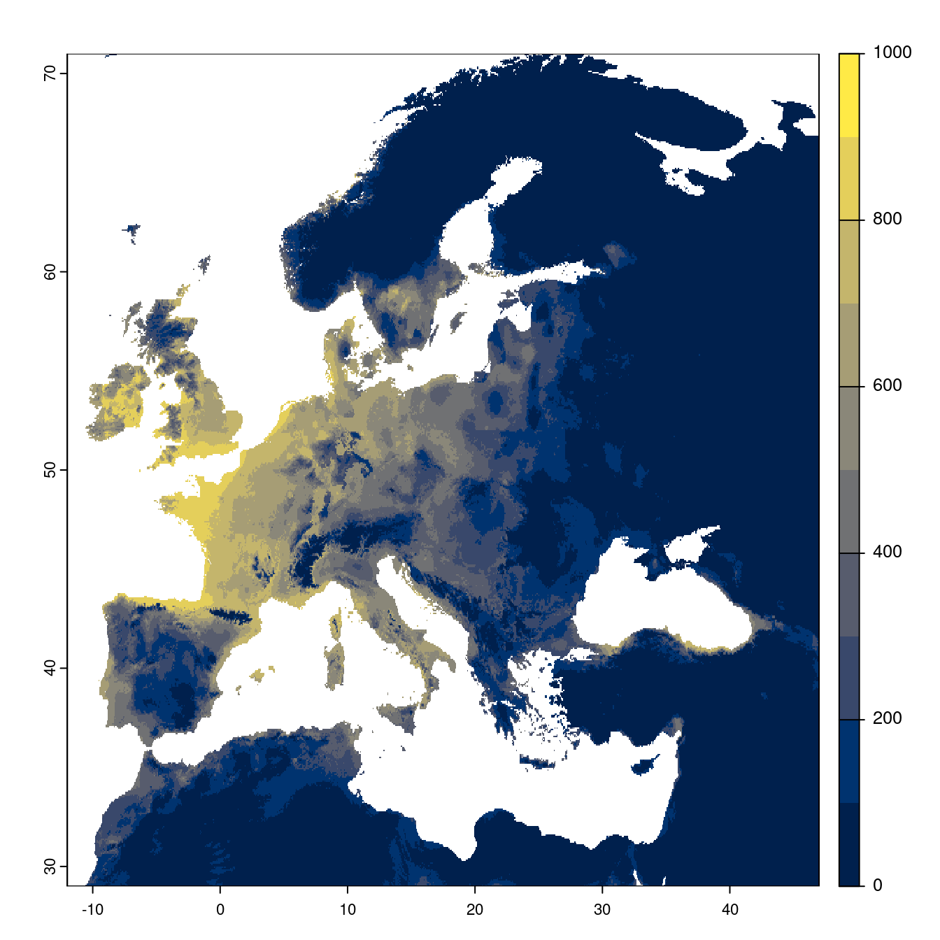 On évalue la proportion d’occurrences dans chaque région, en utilisant les 3 masques créés précédemment. Si on a au moins 50 % des occurrences dans une région, on peut continuer en travaillant uniquement sur ces données. Sinon, on vérifie qu’au moins 67 % des données tombent dans l’ensemble des régions, et on prend la région la plus représentée. Au final, s’il s’agit d’une espèce endémique d’Europe, on n’a pas besoin de manipulation supplémentaire.