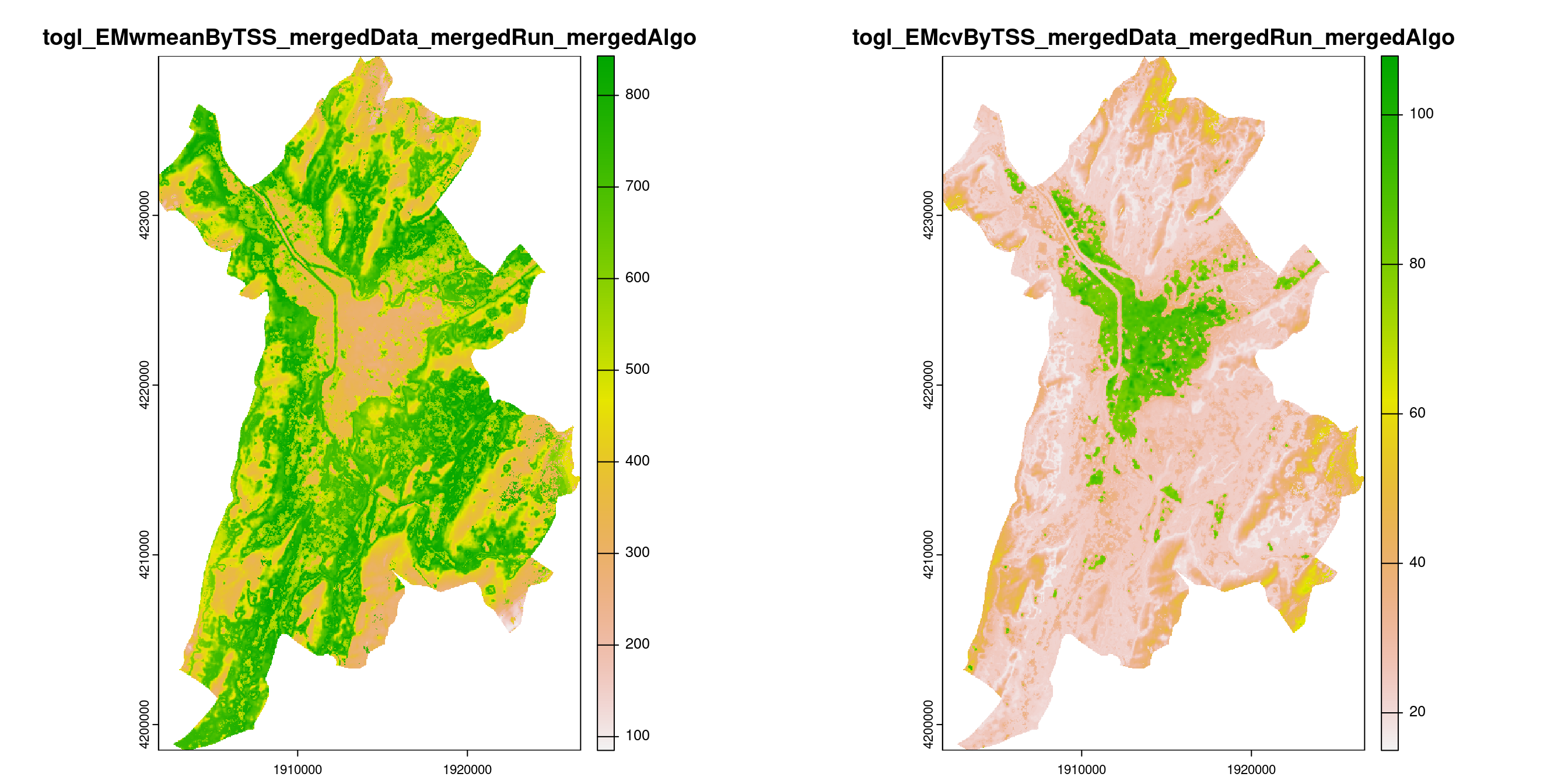 On obtient pour la métrique TSS une carte unique de moyenne pondérée sur les algorithmes et sur les jeux de pseudo-absences.