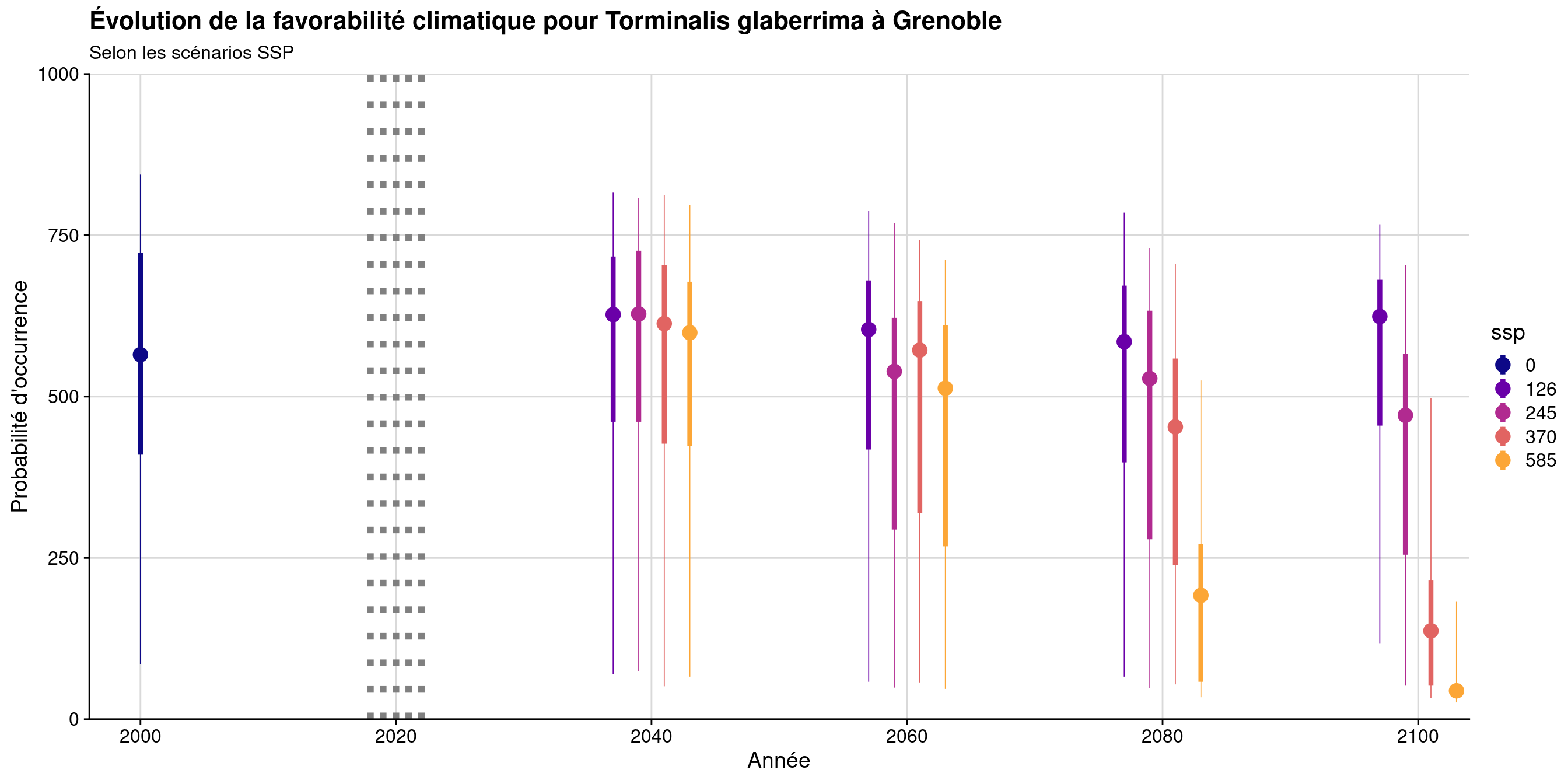 Figure 183.28: Évolution de la favorabilité climatique au cours du XXIème siècle. Le point représente la médiane sur l’étendue de la métropole (i.e. tous les pixels de la carte) ; le trait gras représente 50 % des données intermédiaires (espace inter-quartile) ; le trait fin représente le reste des données du minimum au maximum.