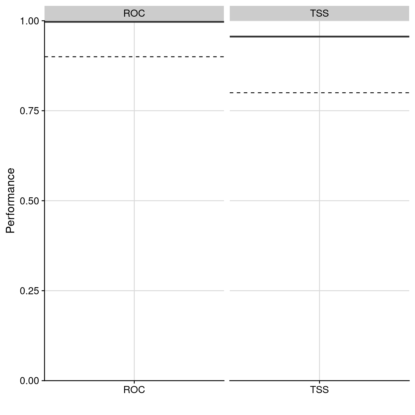 Figure 6.11: Évaluation de la qualité du modèle d’ensemble : Aire sous la courbe de ROC & True Skill Statistic.